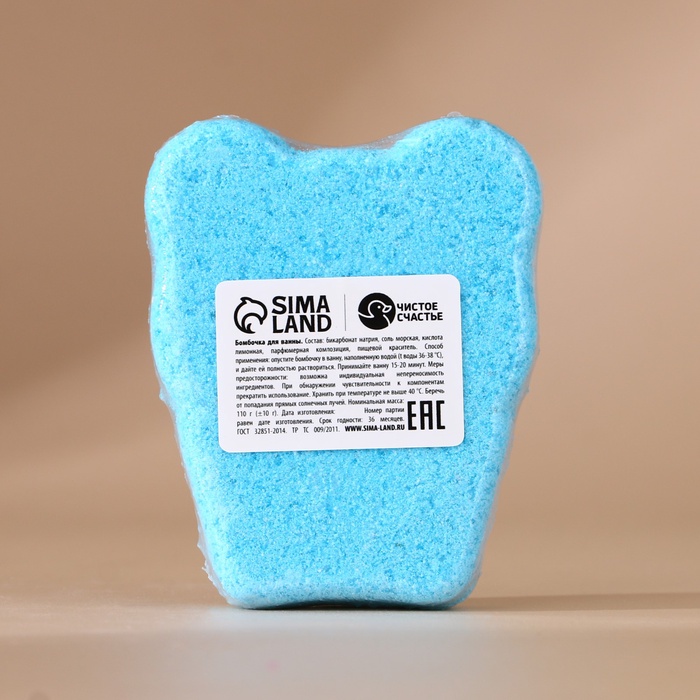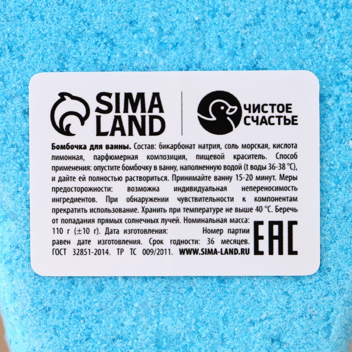 Бомбочка: Бикарбонат натрия, соль морская, кислота лимонная, парфюмерная композиция, пищевой краситель."