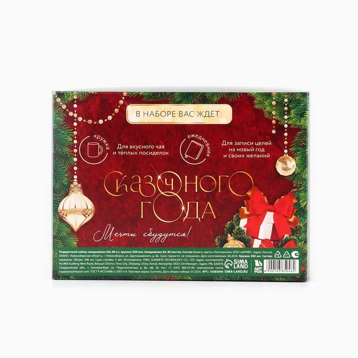 Подарочный набор включает ежедневник формата А6 на 80 листов и кружку объёмом 300 мл. Эти предметы станут отличным презентом для друзей и родных. Ежедневник оформлен в новогоднем дизайне и поможет в планировании дел, а кружка будет напоминать о празднике и согревать горячими напитками.
