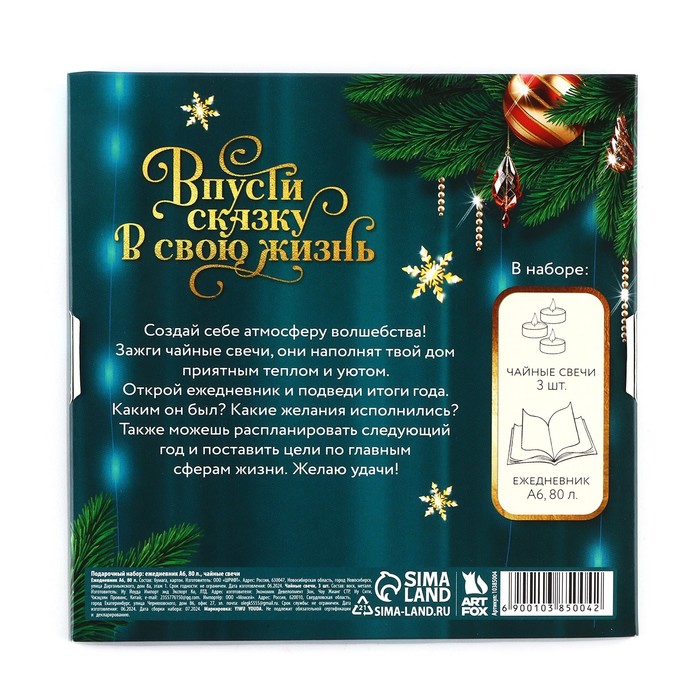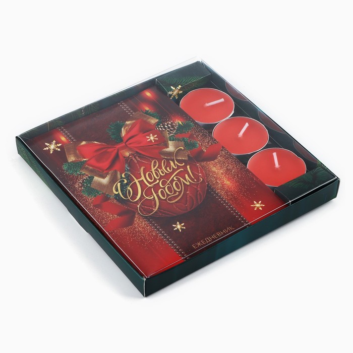 Подарочный набор — отличный выбор для тех, кто ценит уют и гармонию. В наборе вы найдёте ежедневник с новогодним дизайном формата А6 с мягкой обложкой и линейной линовкой на 80 листов, а также чайные свечи с временем горения 3,5 часа. Ежедневник поможет вам эффективно планировать своё время, организовывать задачи или фиксировать идеи, а свечи создадут уютную атмосферу для чтения и отдыха.