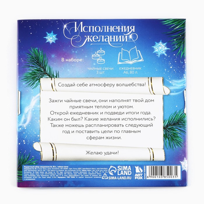 Подарочный набор — отличный выбор для тех, кто ценит уют и гармонию. В наборе вы найдёте ежедневник с новогодним дизайном формата А6 с мягкой обложкой и линейной линовкой на 80 листов, а также чайные свечи с временем горения 3,5 часа. Ежедневник поможет вам эффективно планировать своё время, организовывать задачи или фиксировать идеи, а свечи создадут уютную атмосферу для чтения и отдыха.