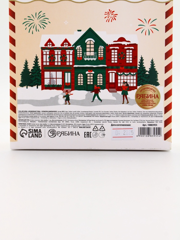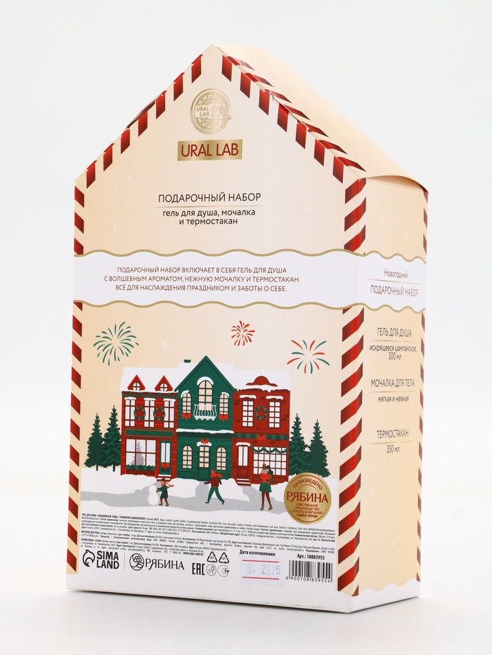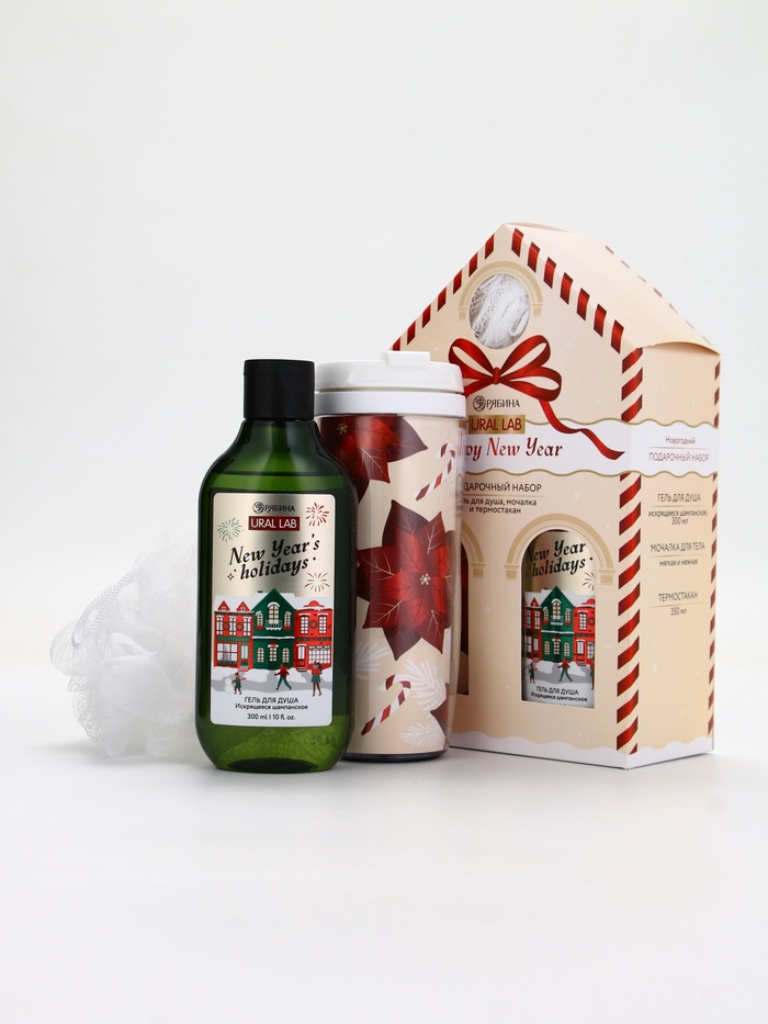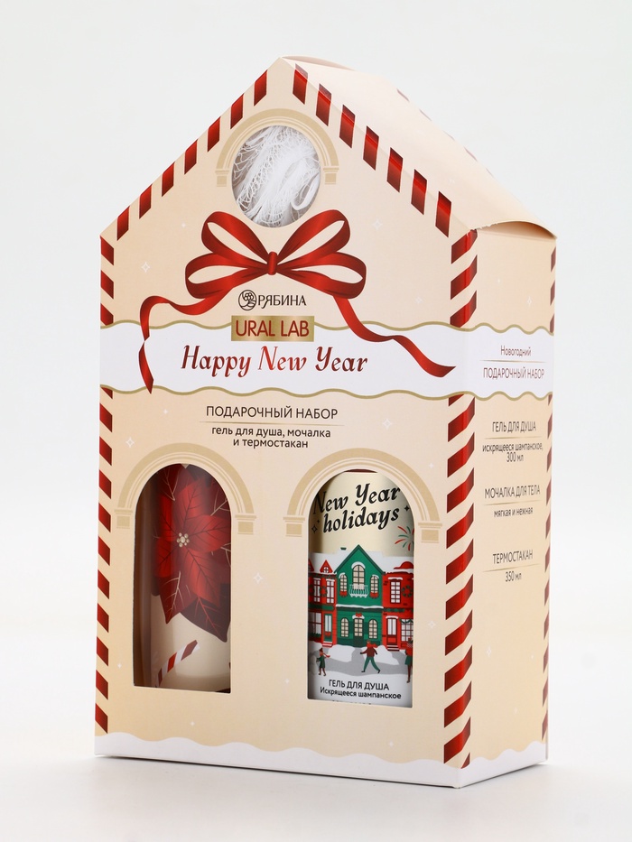 Подарочный набор новогодний Happy New Year: гель для душа, мочалка и термостакан, аромат шампанское, URAL LAB — Характеристики