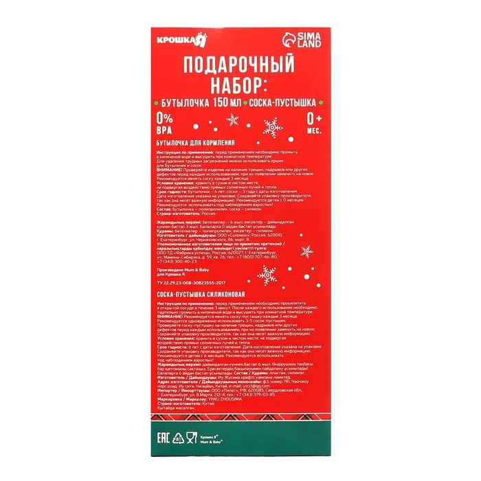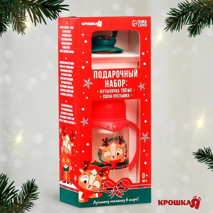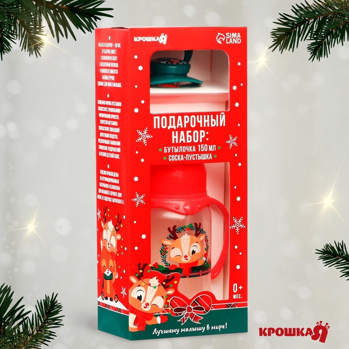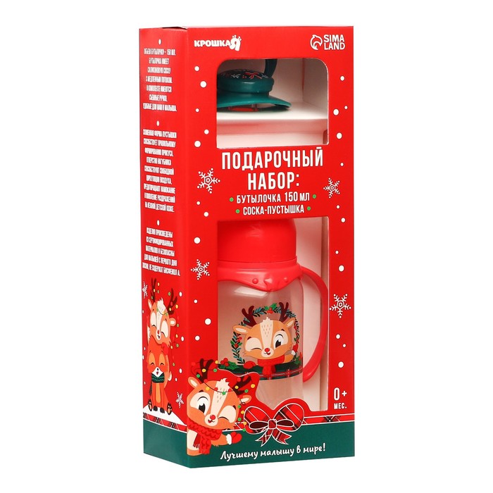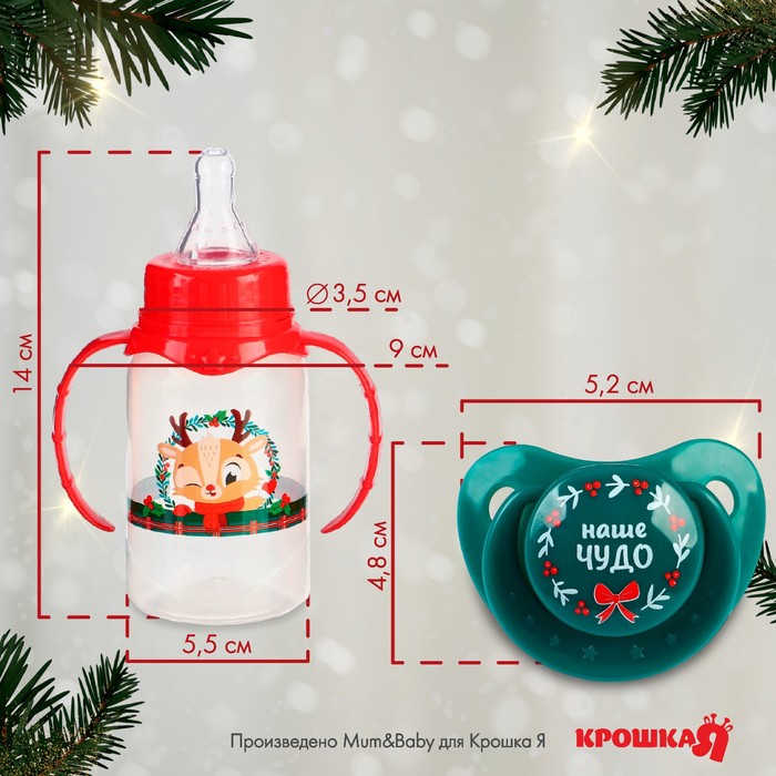 Подарочный набор новогодний Крошка Я «Наше чудо, красная клетка»: бутылочка для кормления 150 мл., пустышка силикон ортодонтическая — Характеристики