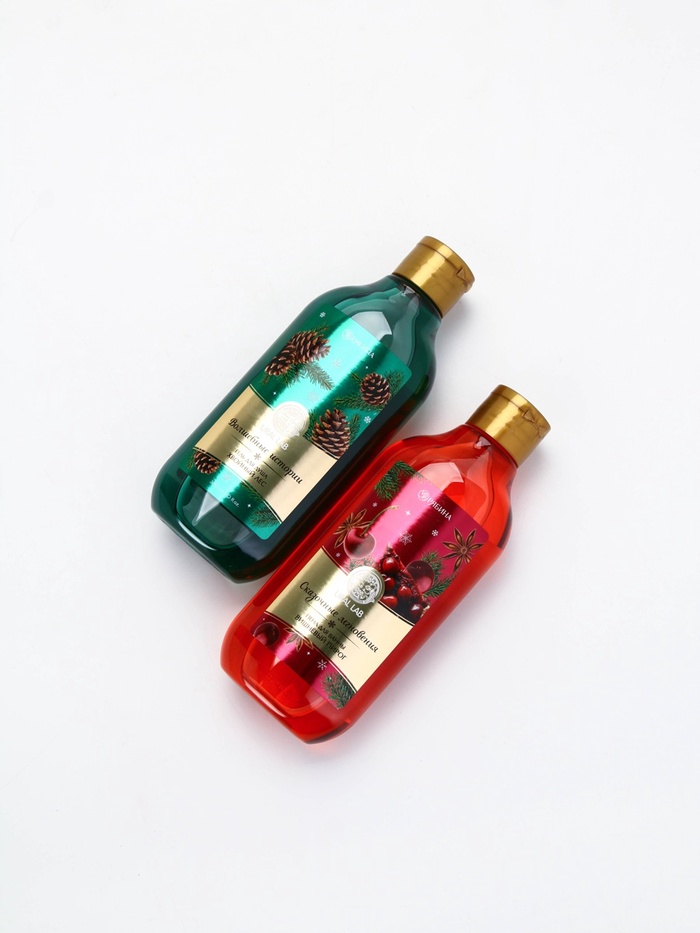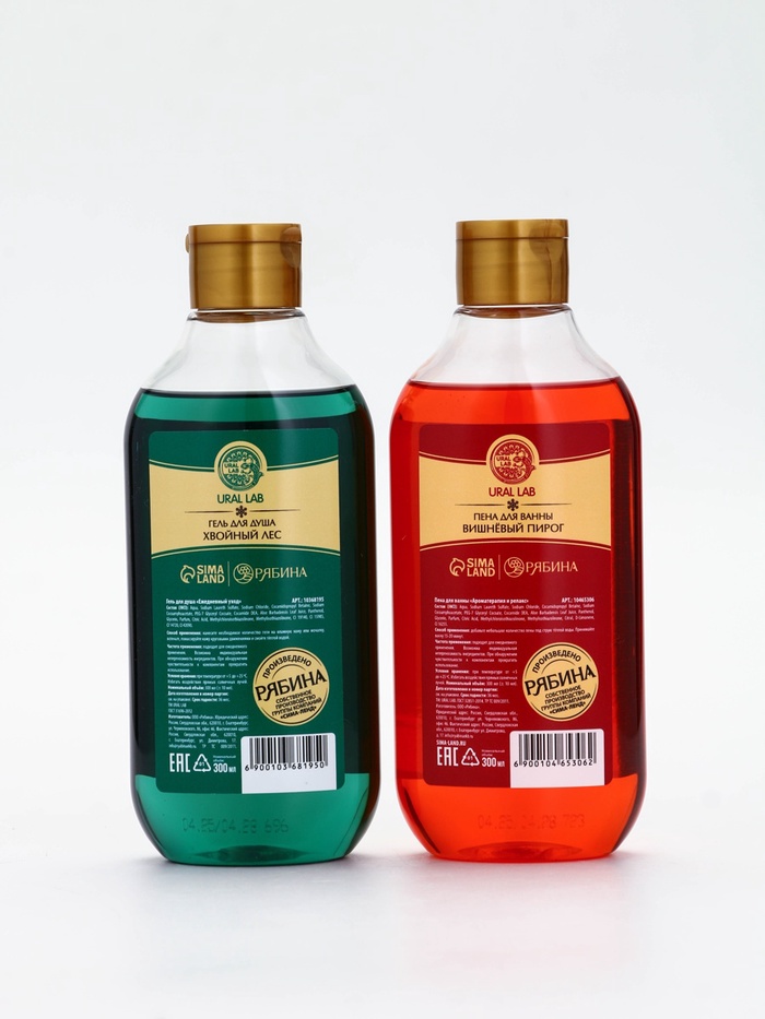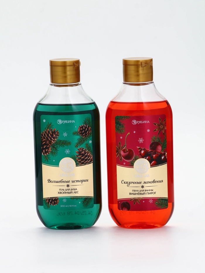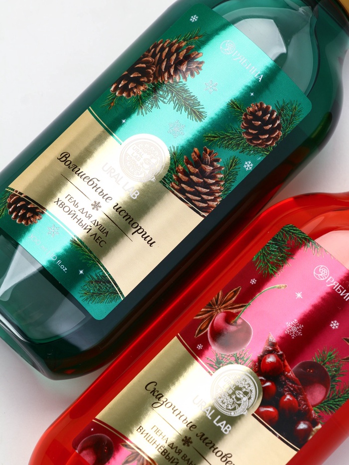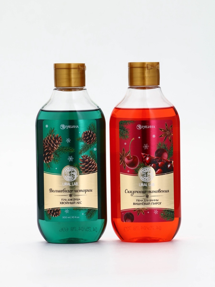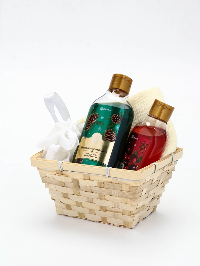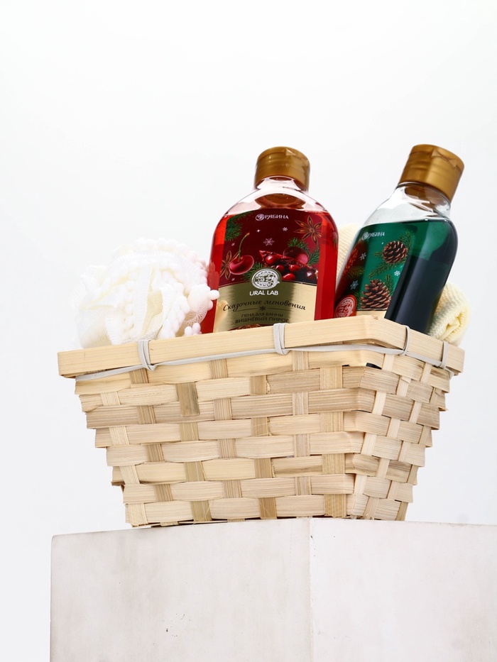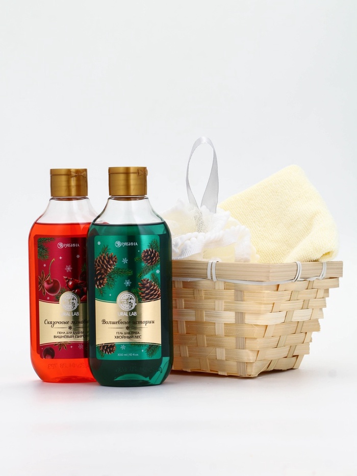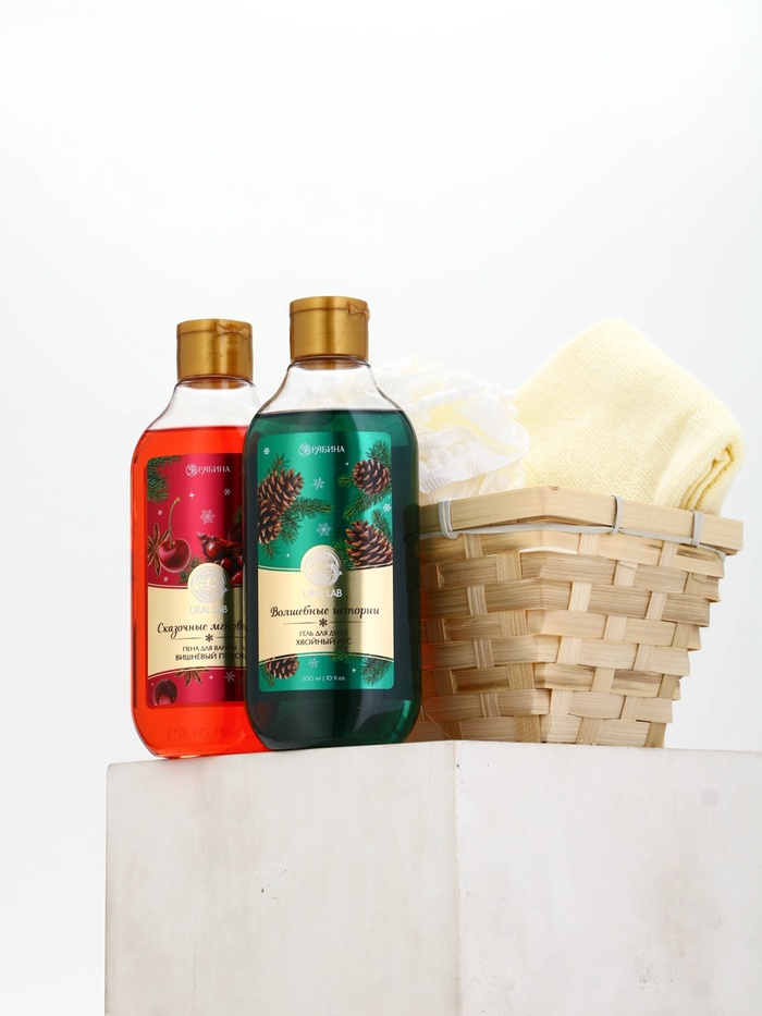 Подарочный набор новогодний в деревянной корзине: гель для душа, пена для ванны и полотенце, аромат хвойный лес и вишнёвый пирог, URAL LAB — Характеристики
