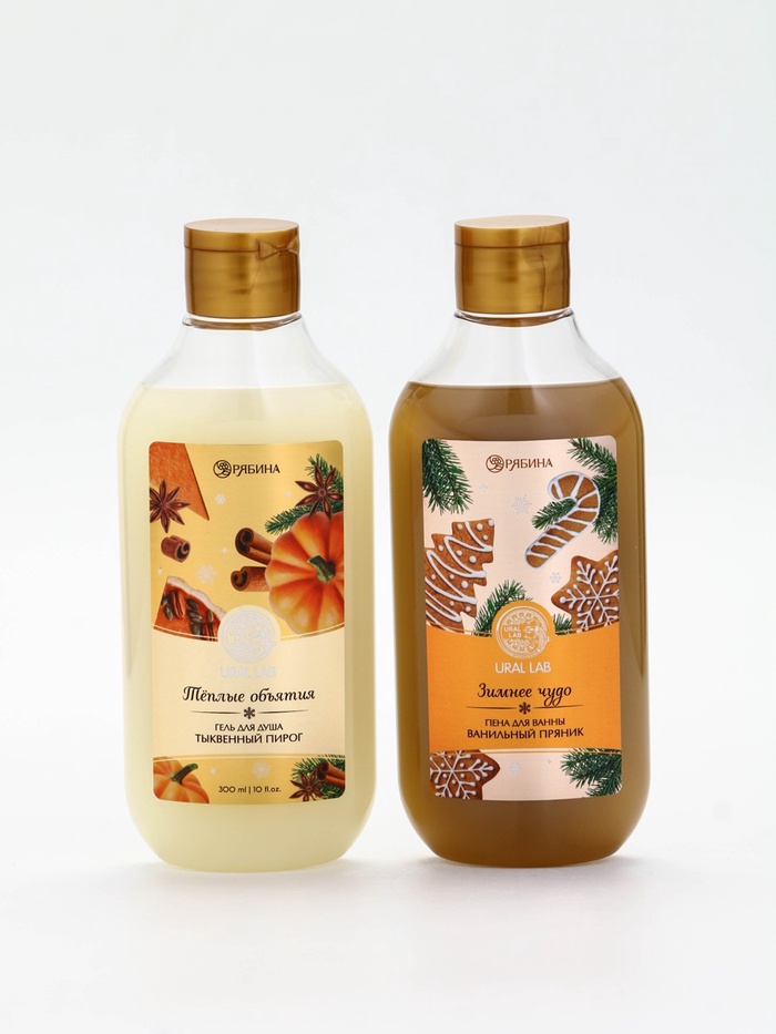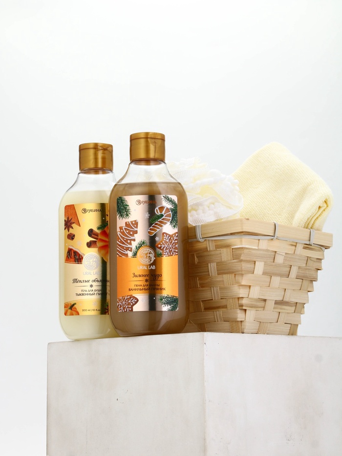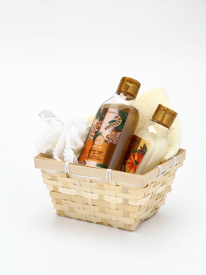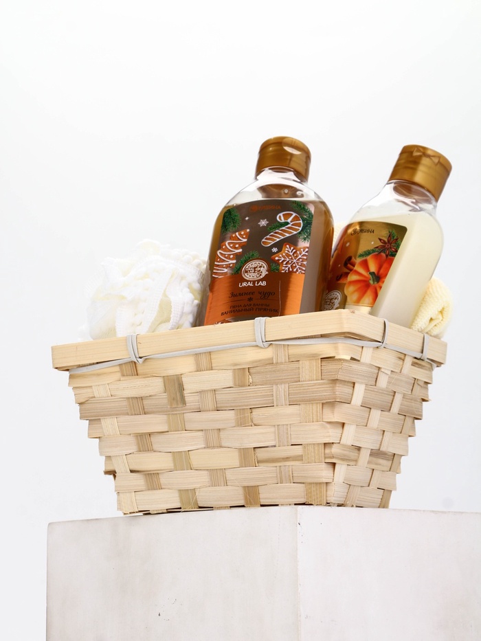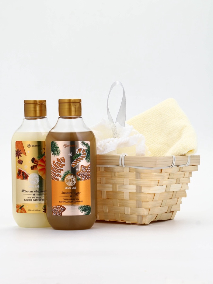 Подарочный набор новогодний в деревянной корзине: гель для душа, пена для ванны и полотенце, аромат тыквенный пирог и ванильный пряник, URAL LAB — Характеристики