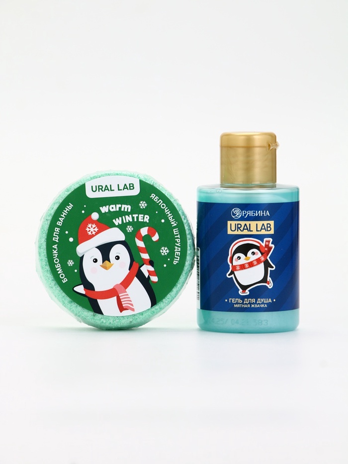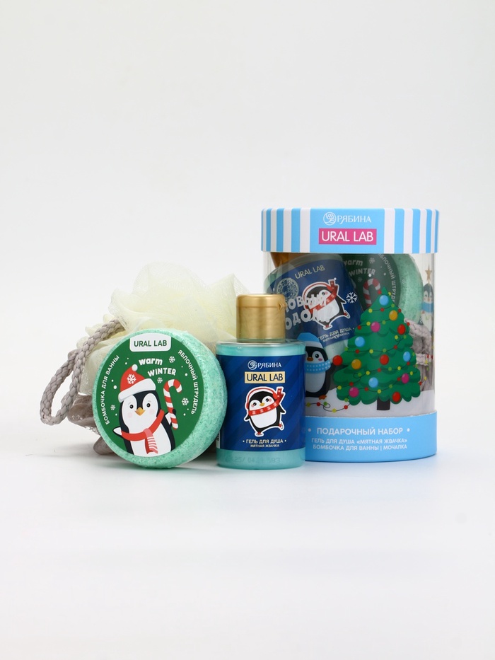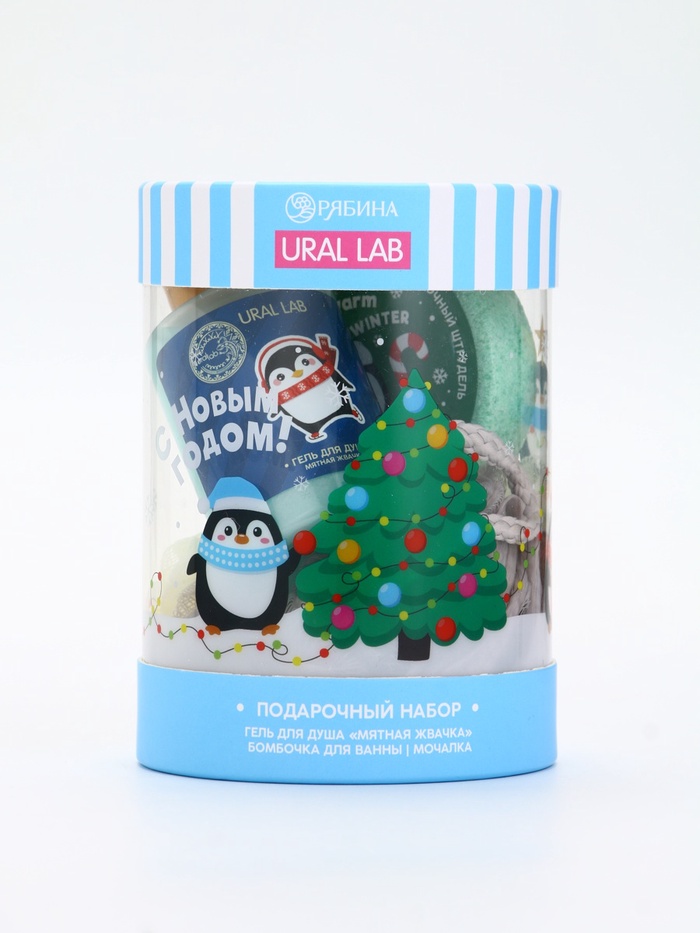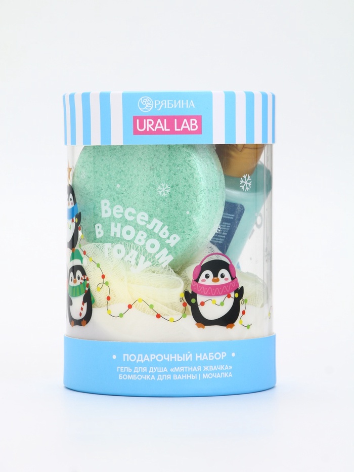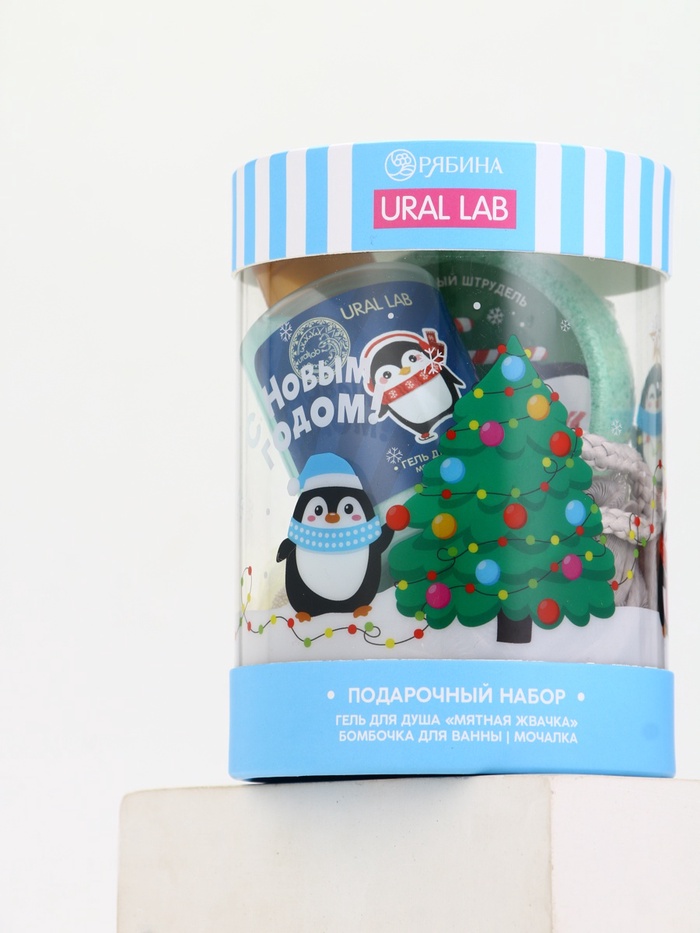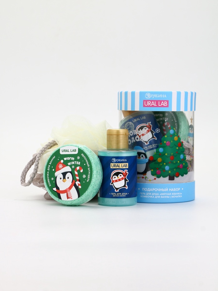 Подарочный набор новогодний в тубусе «Пингвинята», бомбочка, гель, мочалка, URAL LAB — Характеристики