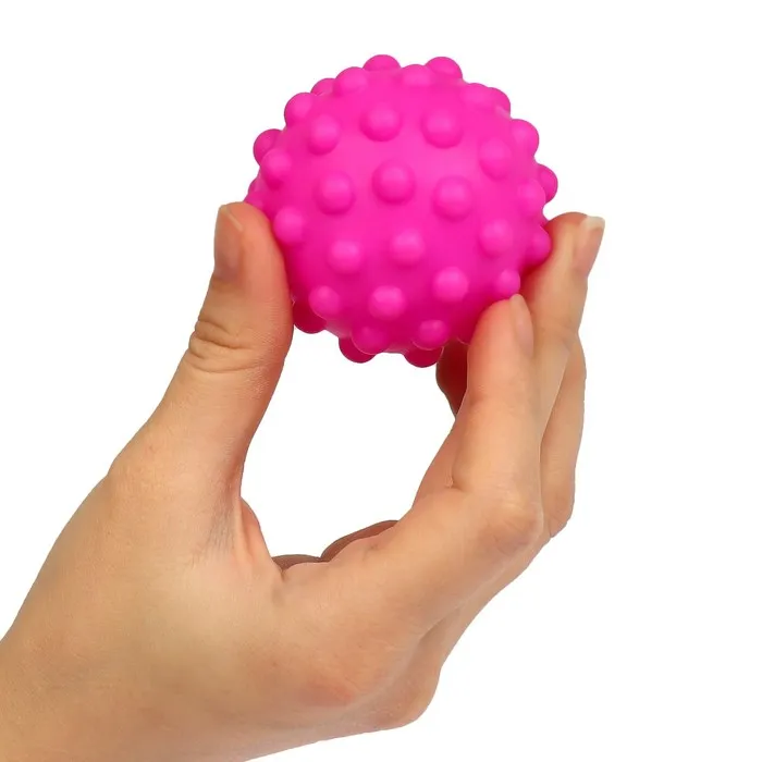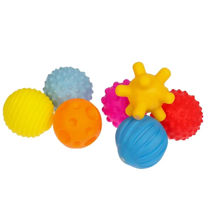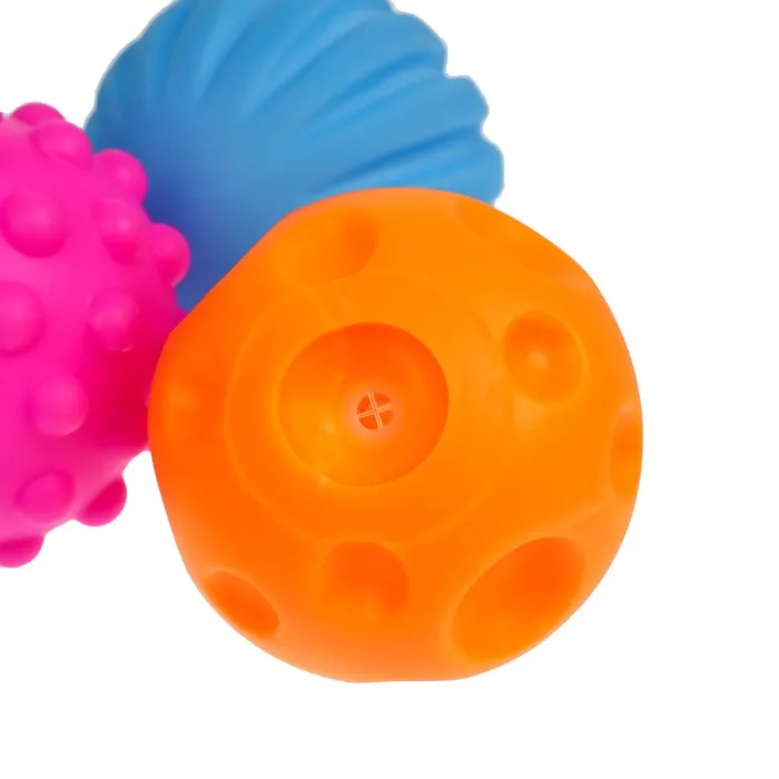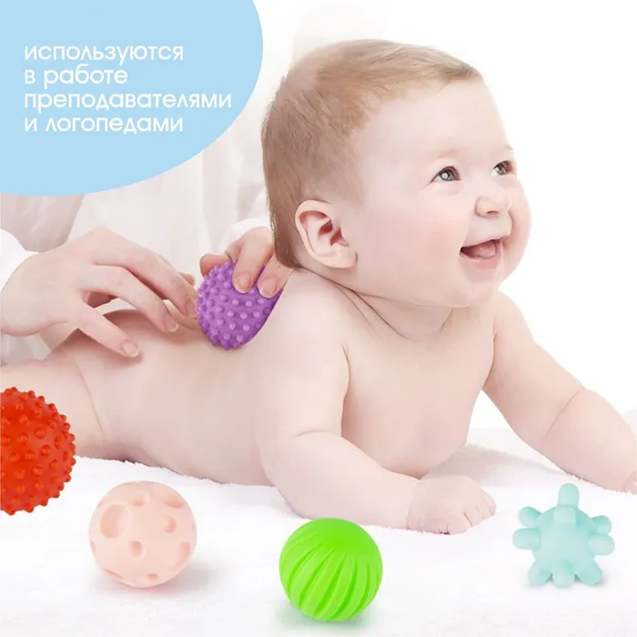 Мячики с рельефной массажной поверхностью способствуют развитию мелкой моторики и тактильных ощущений. Давление на фактурную поверхность мячиков стимулирует и благоприятно воздействует на нервные окончания, ответственные за большинство процессов в организме. Шарики имеют яркие цвета, которые способствуют развитию зрения, а пищалка внутри развивает слуховое восприятие.