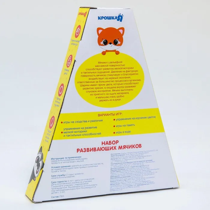 Мячики с рельефной массажной поверхностью способствуют развитию мелкой моторики и тактильных ощущений. Давление на фактурную поверхность мячиков стимулирует и благоприятно воздействует на нервные окончания, ответственные за большинство процессов в организме. Шарики имеют яркие цвета, которые способствуют развитию зрения, а пищалка внутри развивает слуховое восприятие.