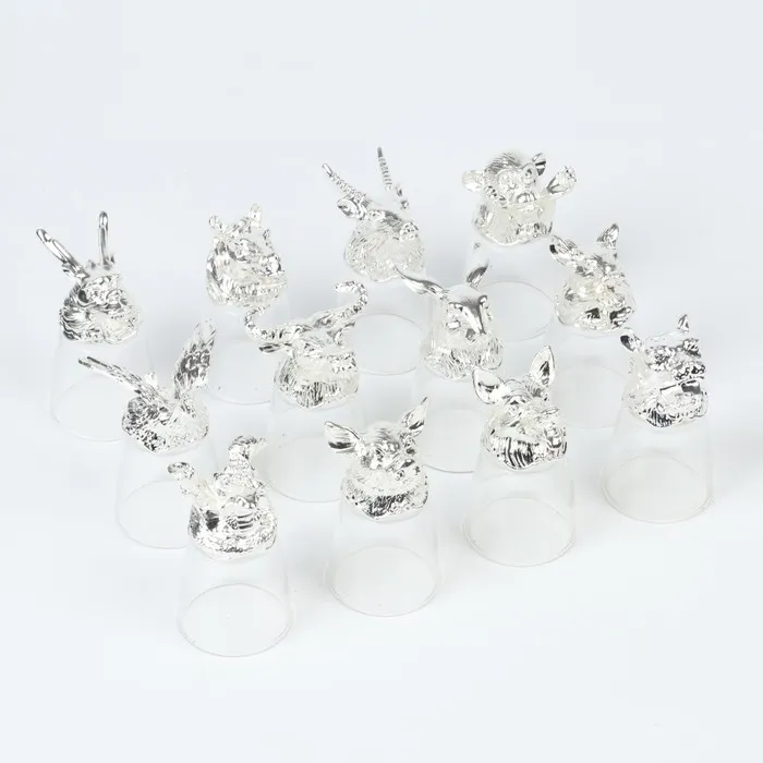 Подарочный набор стопок-перевертышей с головами животных (12 знаков зодиака) в стильном чёрном кожаном чемоданчике с ручкой. Каждая рюмка выполнена в форме фигурки животного из зодиакального цикла и имеет устойчивое основание. Такой набор будет незаменим на большом дружеском застолье или на охотничьем привале, а также станет прекрасным презентом для тех, кто любит оригинальные подарки!
