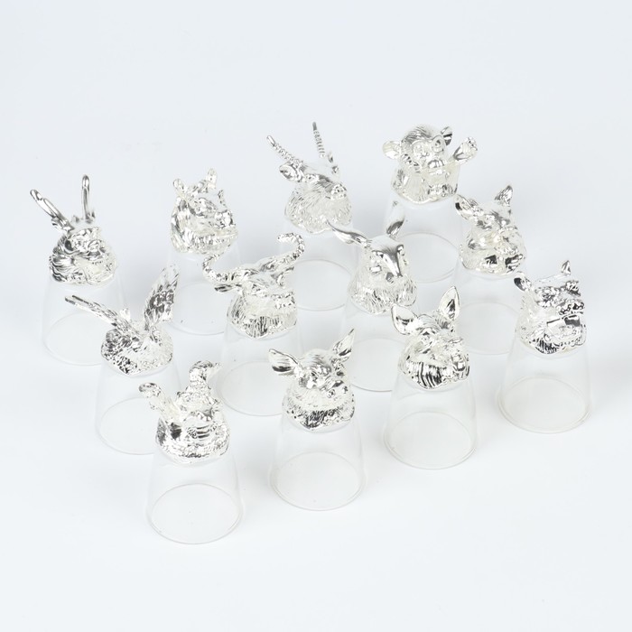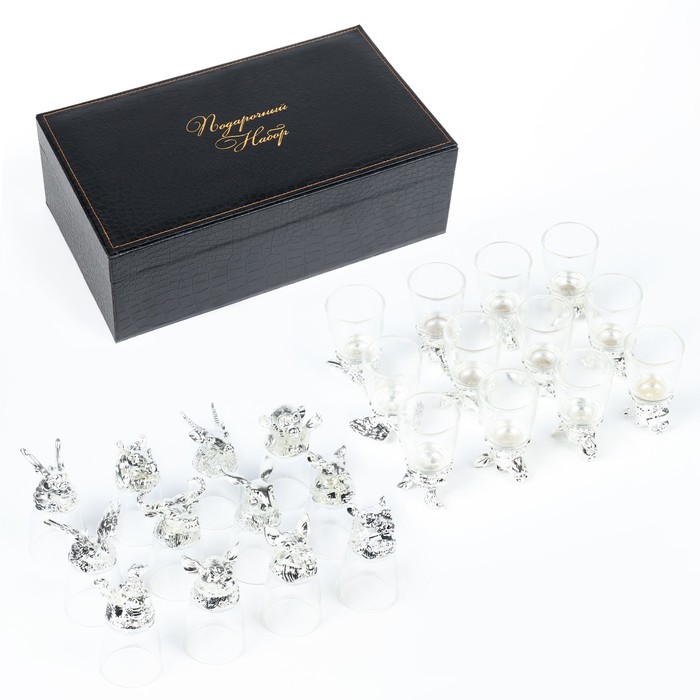 Подарочный набор стопок-перевертышей с головами животных (12 знаков зодиака) в стильном чёрном кожаном чемоданчике с ручкой. Каждая рюмка выполнена в форме фигурки животного из зодиакального цикла и имеет устойчивое основание. Такой набор будет незаменим на большом дружеском застолье или на охотничьем привале, а также станет прекрасным презентом для тех, кто любит оригинальные подарки!