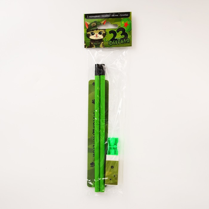 Подарочный набор «С 23 февраля! Котик», линейка, карандаши, точилка и ластик — Характеристики