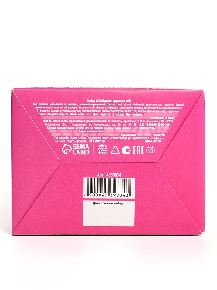 Кружка. Состав: керамика. Срок службы: 5 лет. Чай. Состав: чай черный байховый, ароматизаторы: лимон, мята. Масса нетто: 50 г. Срок годности: 36 месяцев.