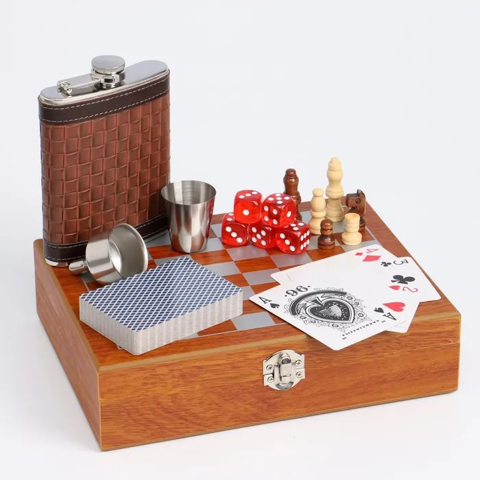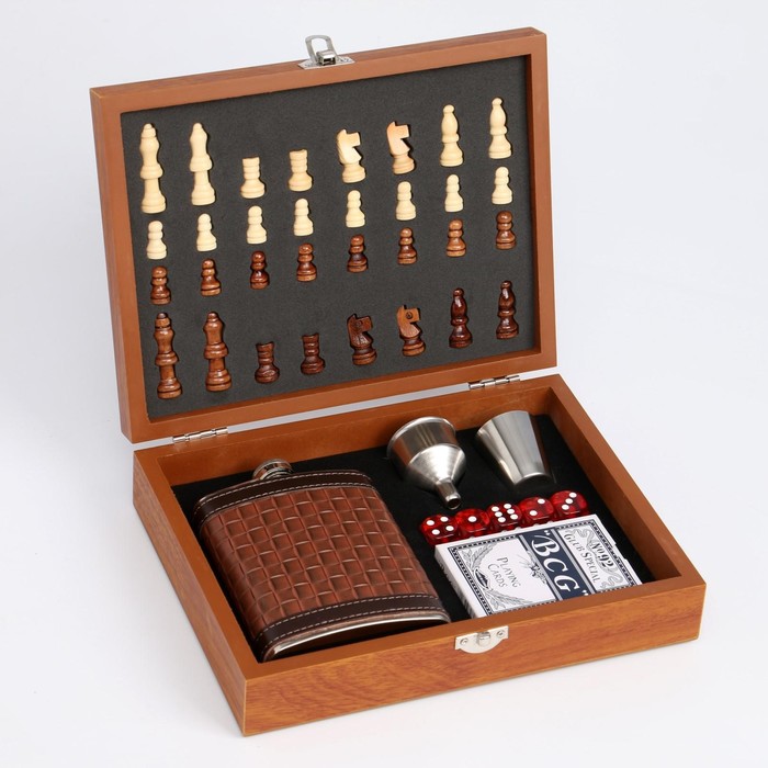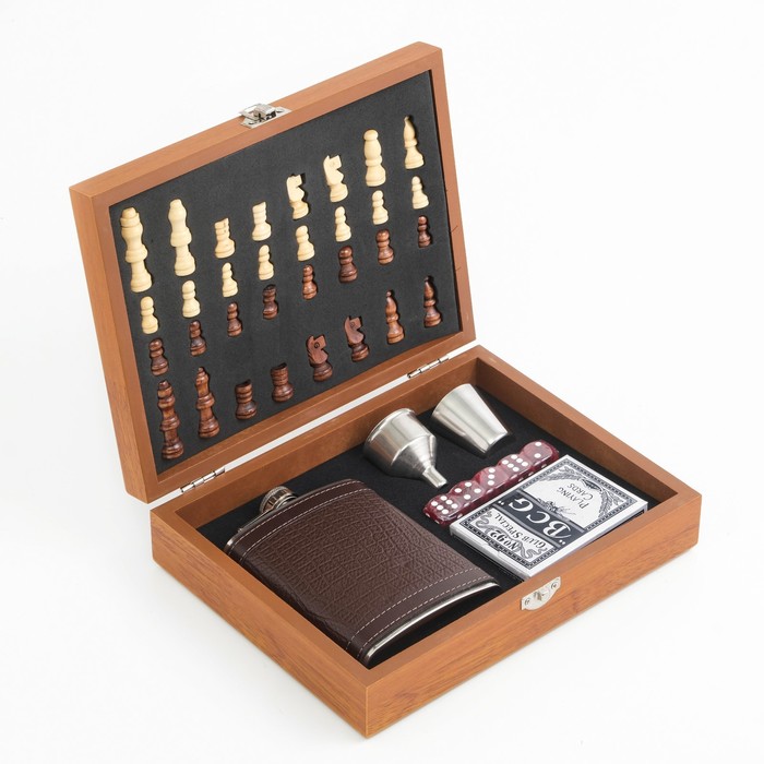 Подарочный набор - это универсальный набор, который включает в себя всё необходимое для приятного времяпрепровождения. В нём есть фляжка, рюмка, воронка, игральные кубики, карты и шахматы.