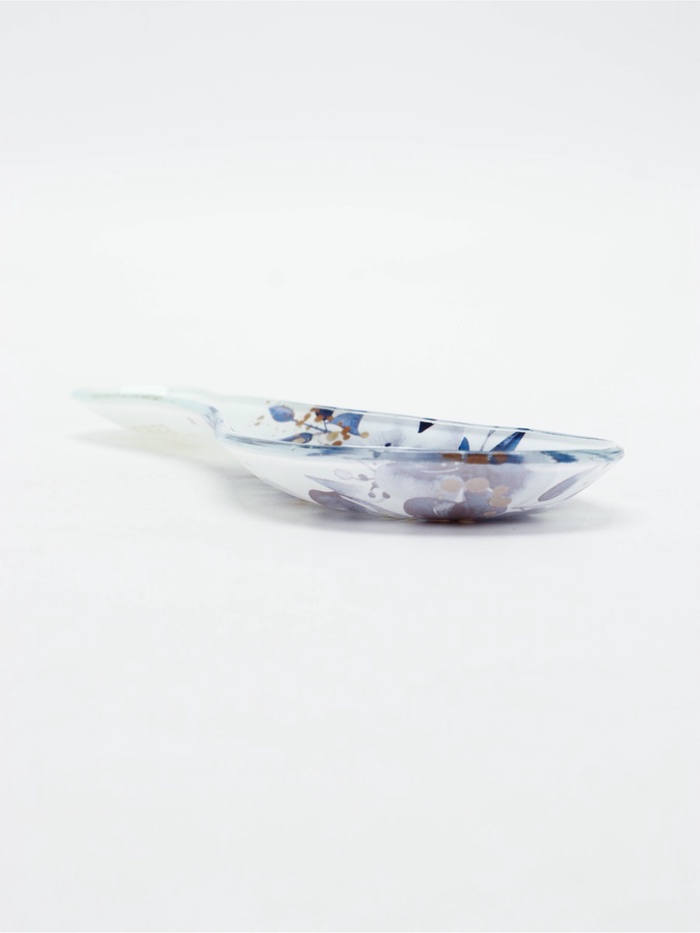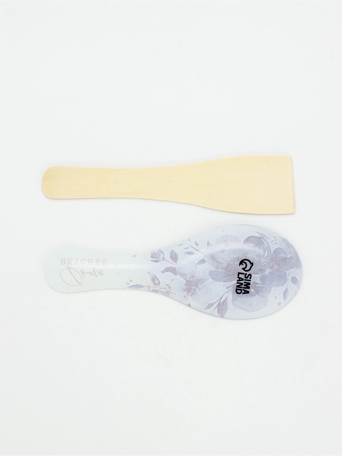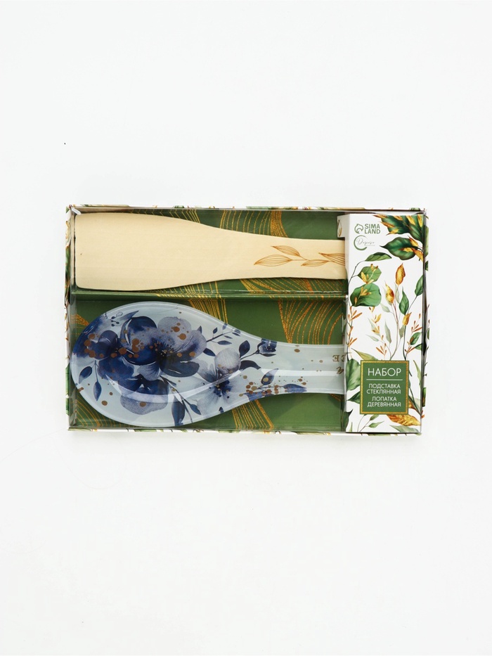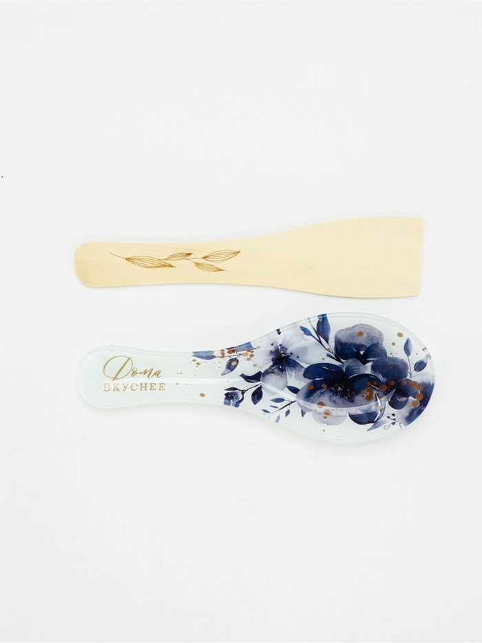 В набор входят два элемента: стеклянная подставка под ложку и натуральная деревянная лопатка.