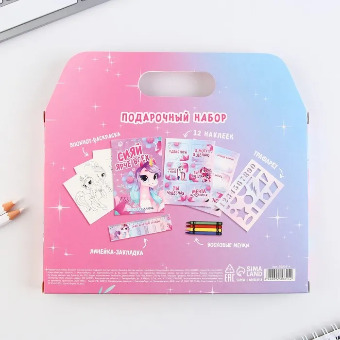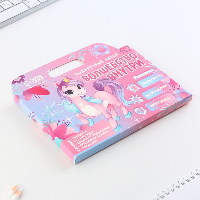 Подарочный набор «Волшебство внутри», блокнот-раскраска, трафарет и восковые мелки — Характеристики