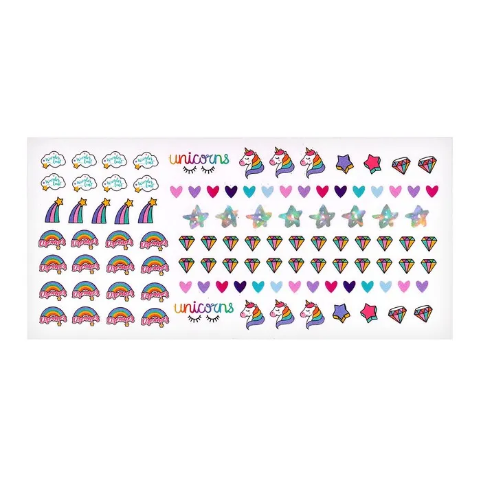 - Лак для ногтей розового цвета и наклейки, которыми девочка сможет украсить любимые предметы или создать яркий дизайн на ногтях!