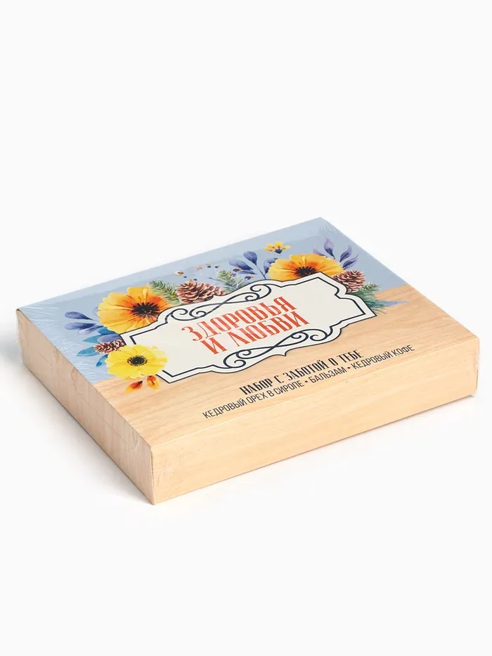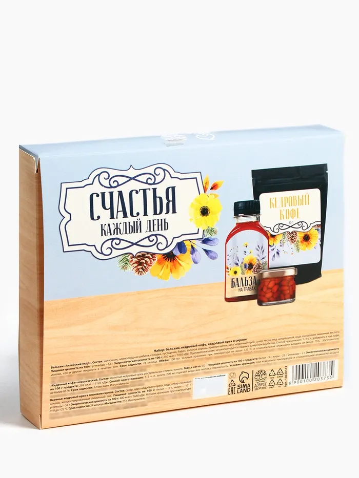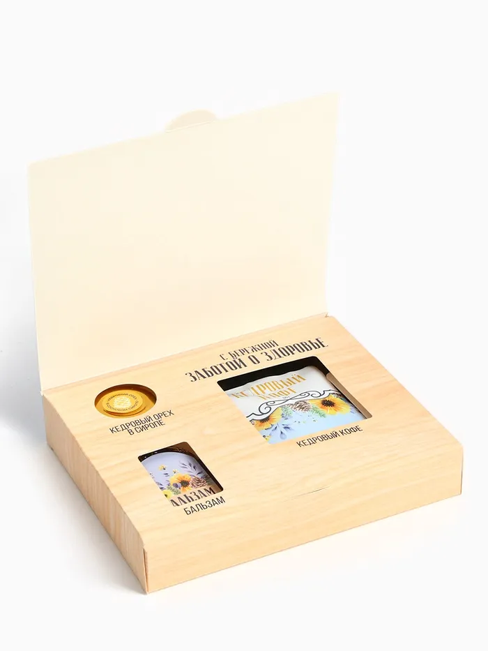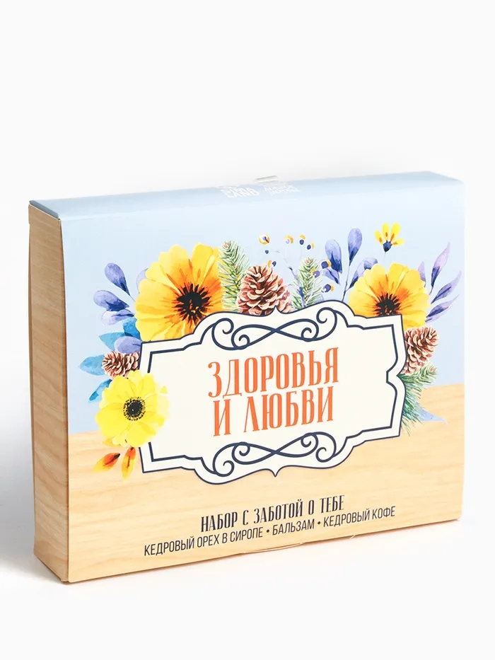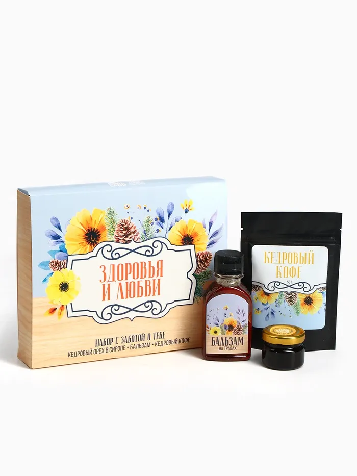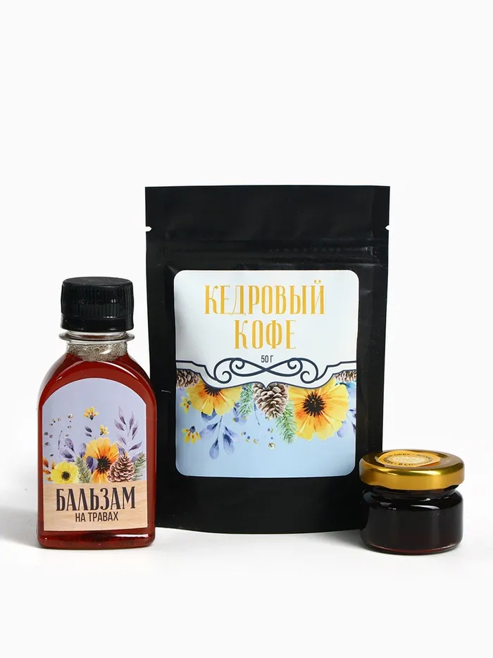 Подарочный набор «Здоровья и любви»: кедровый орех в сосновом сиропе 25 г., бальзам 100 мл., кедровый кофе 50 г. — Характеристики