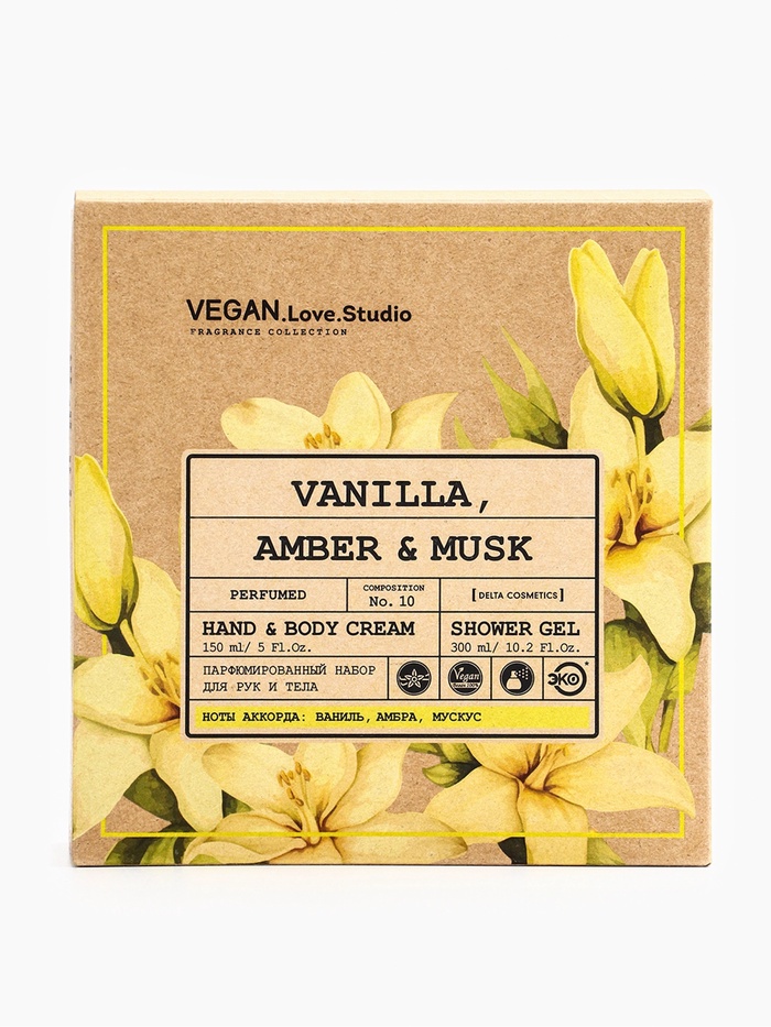 Подарочный набор VEGAN.Love.Studio создан для женщин, которые ценят комплексный уход за кожей и утончённые ароматы. В набор входят гель для душа и крем-лосьон с парфюмированным ароматом ванили, амбры и мускуса, обеспечивающие мягкое очищение, увлажнение и длительное ощущение ухоженности, комфорта и свежести.