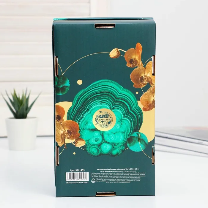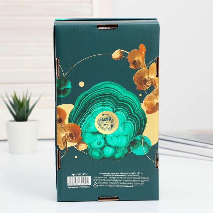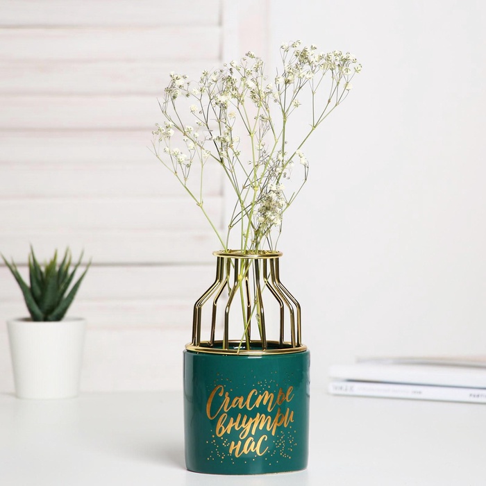 Подарочный набор станет отличным подарком на Новый Год, Рождество, Пасху, 14 февраля, 8 марта или День Рождения. Ваза для цветов состоит из двух частей: керамической и металлической. На керамическую часть нанесен красивый золотистый рисунок, который выполнен в технике деколь. Металлическую часть вазы можно легко снять и поставить в нее сухоцветы, а керамическую использовать в качестве миниатюрного горшка или стакана. Золотистая фигурка выполнена из керамики, которая окрашена золотой краской. Набор надежно упакован в картонную подарочную коробку с эксклюзивным дизайном.