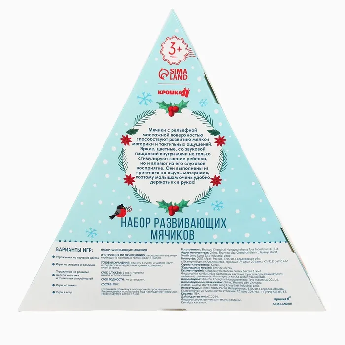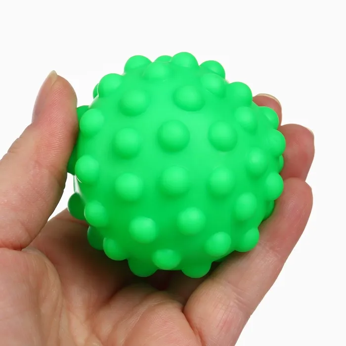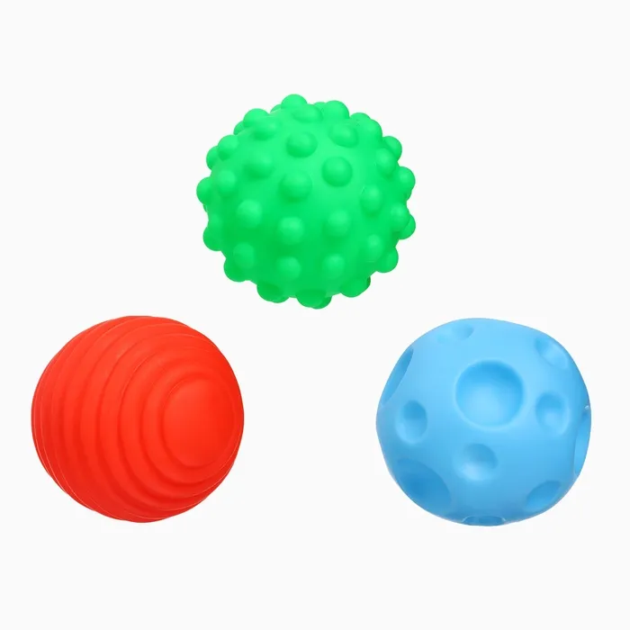 Давление на фактурную поверхность мячиков стимулирует и благоприятно воздействует на нервные окончания, ответственные за большинство процессов в организме. Шарики имеют яркие цвета, которые способствуют развитию зрения, а пищалка внутри развивает слуховое восприятие.