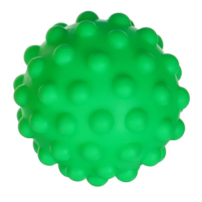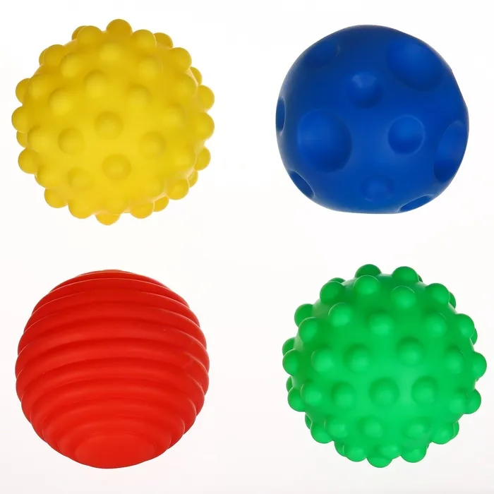 Давление на фактурную поверхность мячиков стимулирует и благоприятно воздействует на нервные окончания, ответственные за большинство процессов в организме. Шарики имеют яркие цвета, которые способствуют развитию зрения, а пищалка внутри развивает слуховое восприятие.