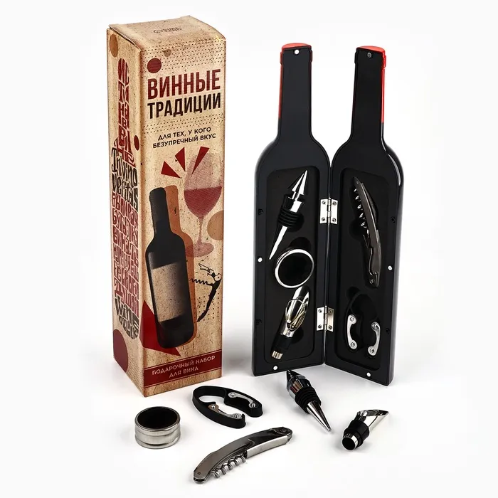 Подарочный винный набор: штопор, аэратор, каплеулавливатель, пробка для бутылки вина и нож для фольги «Идеального вечера». — Характеристики