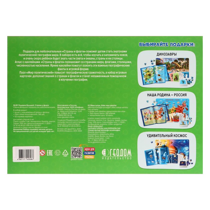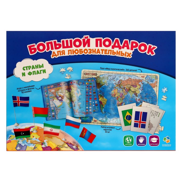 Подарок большой «Страны и флаги», пазл 260 деталей, атлас с наклейками + карточки — Характеристики
