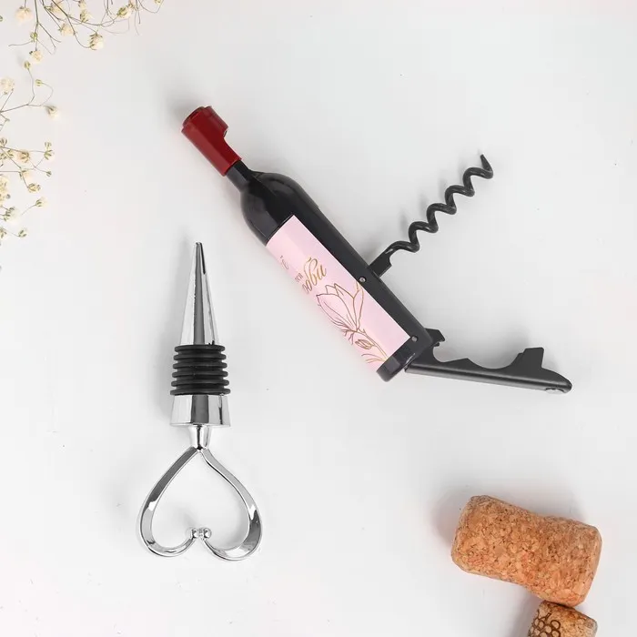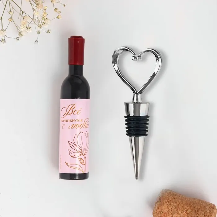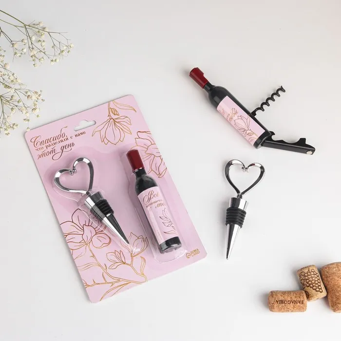 Набор штопор и пробка для бутылки станет прекрасным комплиментом для ваших гостей. Запоминающийся подарок для ваших близких на память о важном дне. Декоративный штопор для вина - стильный аксессуар, который пригодится на любой кухне. Штопор предназначен для вина и других напитков с пробковыми крышками. Эргономичная ручка штопора обеспечивает надежный удобный захват. Инструмент снабжен откидной открывашкой для пива и бутылок с кронепробками. Штопор декорирован в форме бутылки вина, поэтому станет забавным сувениром для родственниц, подруг и коллег. В комплект входит аэратор для вина, винная пробка и картонная подложка для набора. Размер штопора 12 х 2,5 см, пробка длиной 10,5 см. Набор универсален для любого праздника, и подойдёт как подарок вашим гостям на свадьбе, на юбилее, на дне рождении и т.д. Этот сувенир можно вручить в знак благодарности за участие в вашем торжестве. Оригинальный подарок - это отличный способ сказать спасибо тем, кто разделил ваш самый счастливый день.