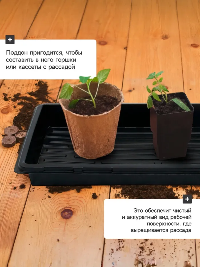 Поддон пригодится, чтобы составить в него горшки или кассеты с рассадой. Это обеспечит чистый и аккуратный вид рабочей поверхности, где выращивается рассада.