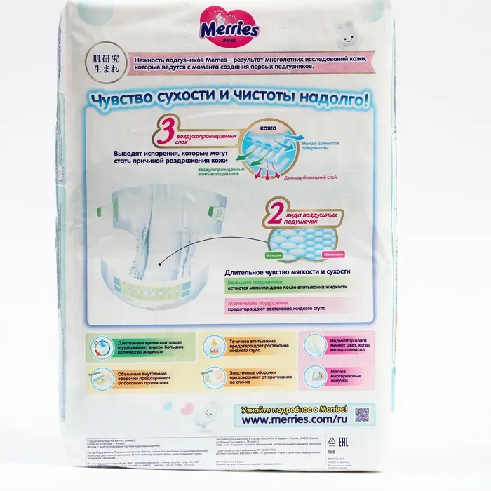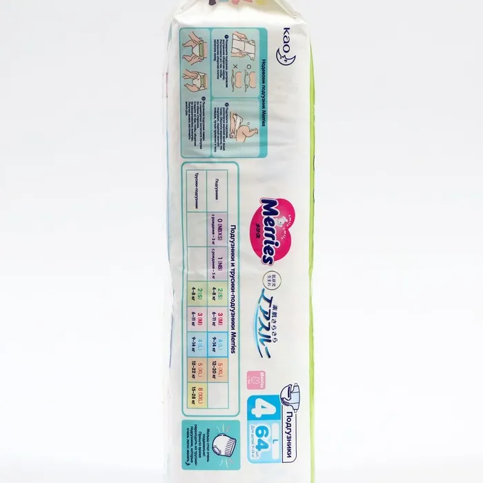 В упаковке 64 штуки, что обеспечивает достаточное количество подгузников на долгое время. Merries — ваш надёжный помощник в уходе за малышом!