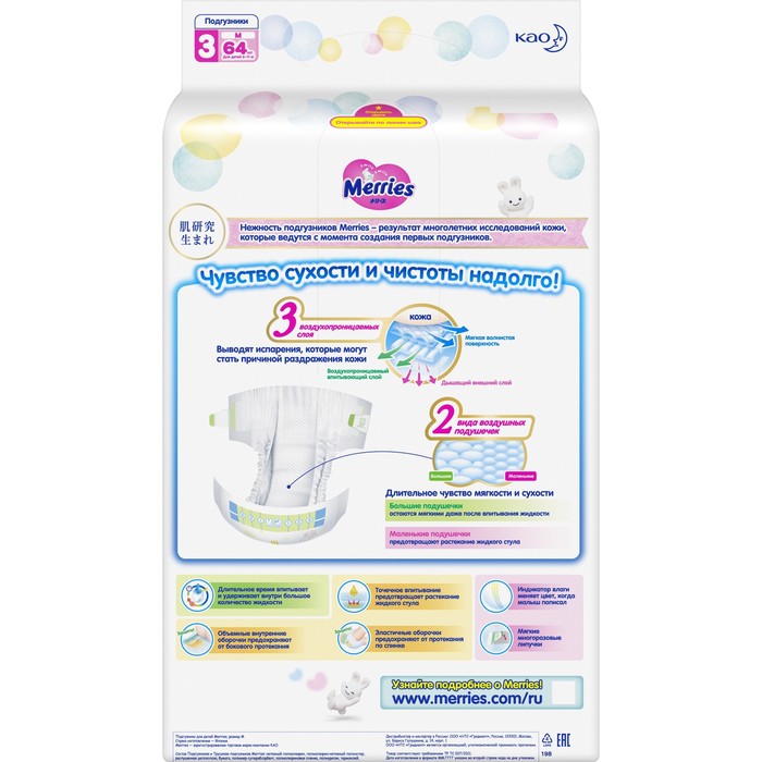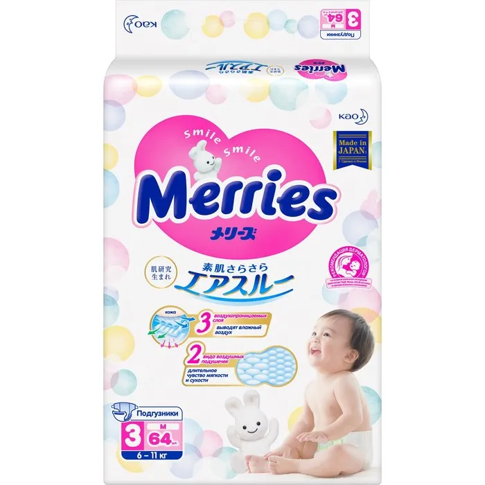 Подвижным малышам отлично подойдут подгузники Merries M, рассчитанные на детей весом от 6 до 11 кг. Три дышащих слоя позволяют коже оставаться сухой и надёжно защищают от опрелостей: внутренний особо мягкий волнистый слой отводит испарения наружу, через воздушные каналы второго слоя, который активно впитывает жидкость, а третий удерживает жидкость, пропуская влажный воздух.