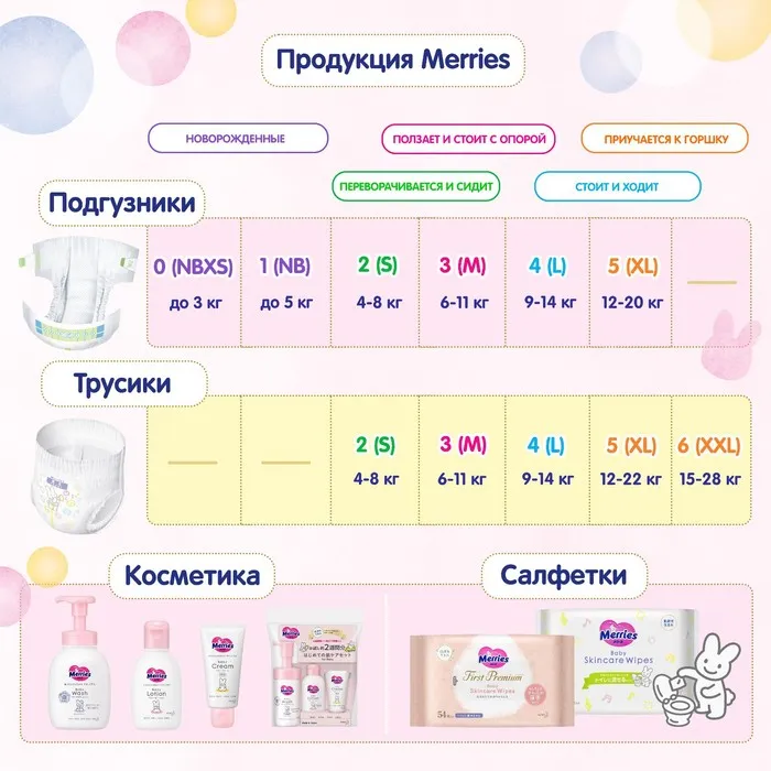 Надёжная резинка на спинке и оборки вокруг ножек снижают риск протекания. Многоразовые липучки имеют скруглённые края, поэтому не натирают нежную кожу крохи. Вы не пропустите момент, когда пора менять подгузник: три полоски индикатора по центру станут синего цвета.