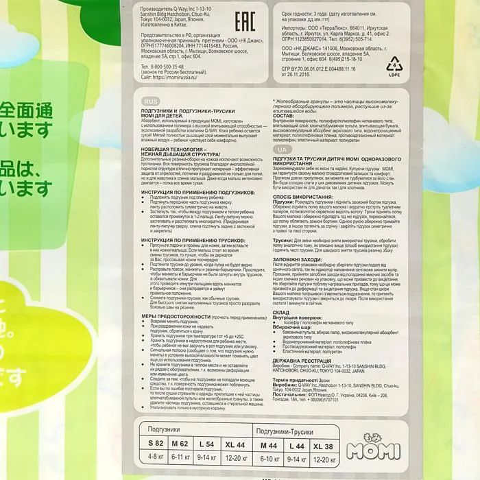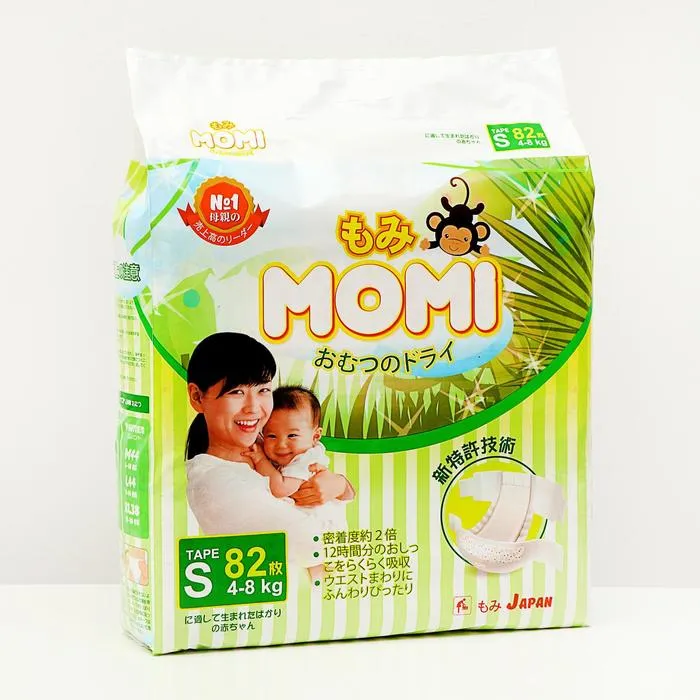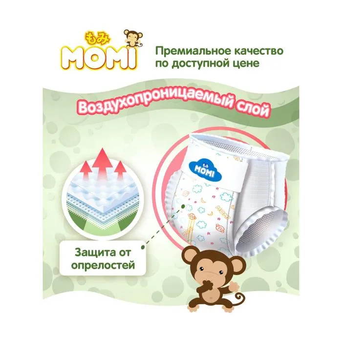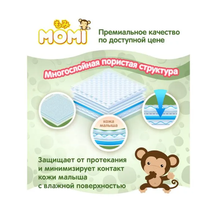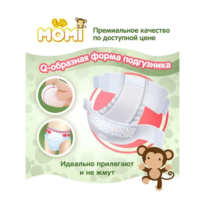 Подгузники MOMI – это подгузники, созданные Японскими технологами в Токийской компании Q-Way. Тщательный отбор самых мягких и качественных материалов с учетом особенностей нежной и чувствительной кожи малыша. Используется только премиальный японский абсорбент, что обеспечивает равномерное и быстрое впитывание по всей поверхности внутреннего слоя, позволяя малышу чувствовать себя комфортно. Многоразовые липучки удобно закрепляют подгузник на малыше от 4 до 8 кг. Для максимального комфорта воспользуйтесь номерами на пояске, помогающими симметрично закрепить липучки. При надевании подгузника не забывайте поправлять внутренние резиночки-бортики, которые блокируют боковые протекания.