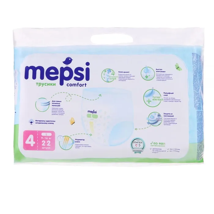 Подгузники-трусики Mepsi размера L (9–16 кг) — идеальный выбор для комфорта и гигиены вашего малыша. Они изготовлены из высококачественных материалов, обеспечивающих сухость и комфорт в течение всего дня.