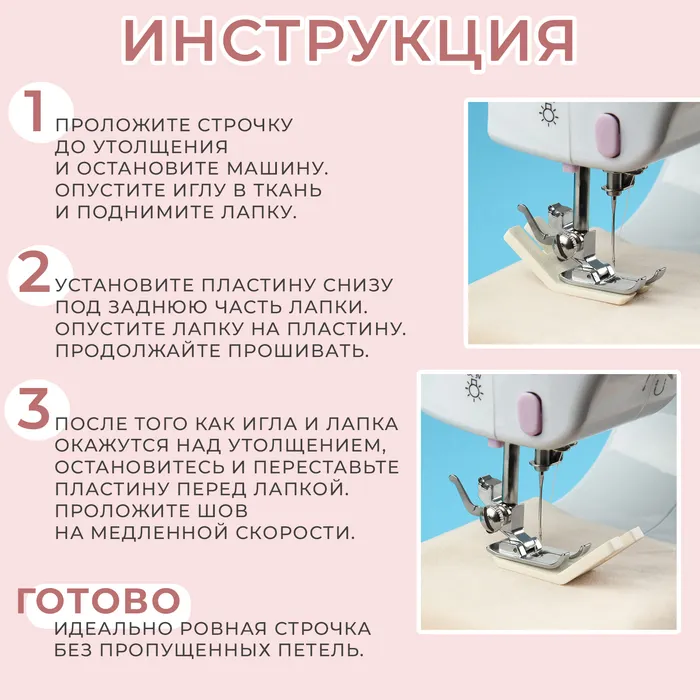 Пластина размещается под лапкой при обработке сложных участков, в результате чего получаются ровные и надёжные стежки разной толщины. Благодаря этому вы можете предотвратить пропуски швов, снизить риск поломки иглы и исключить возможность неровных швов.