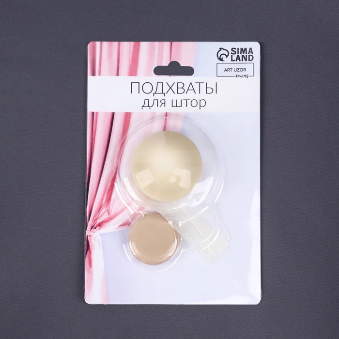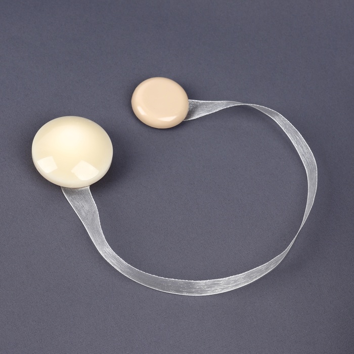 Молочные шторные держатели на ленте — элегантный способ придать шторам аккуратный вид. Круглые подхваты с глянцевой поверхностью мягко переливаются на свету, дополняя интерьер в нейтральных тонах. Бежевый оттенок гармонирует с классическими и современными стилями, не привлекая излишнего внимания.