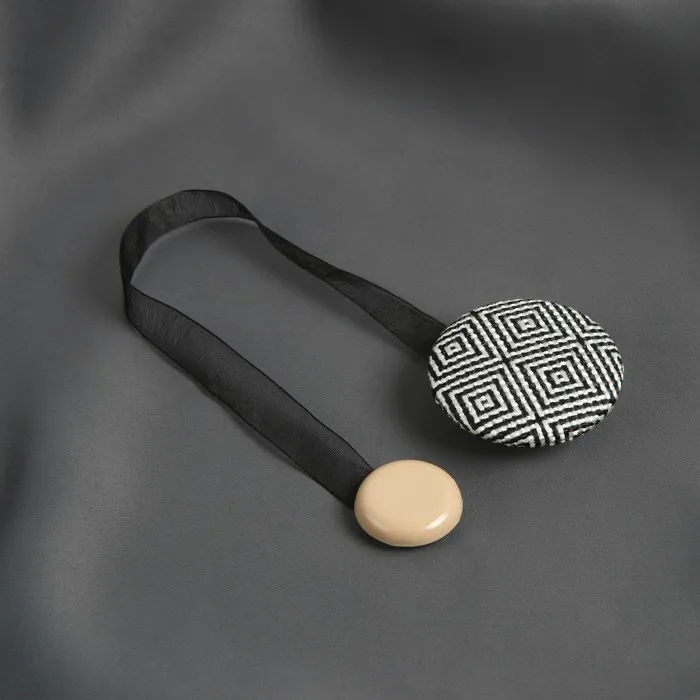 Подхват для штор на ленте с круглой вставкой — это минималистичный аксессуар, который помогает упорядочить оконное пространство и при этом оставаться частью стильного интерьера. Чёрно-белая палитра задаёт строгий, но универсальный тон, подходящий как к монохромным, так и к контрастным интерьерам. Круглая форма делает образ мягче, не нарушая графической выразительности цветовой гаммы.