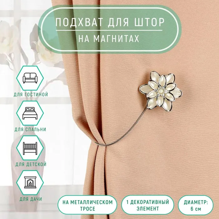 Элегантный подхват для штор в виде перламутровой жемчужины цветах добавит изысканности вашему интерьеру. Этот стильный аксессуар не только поддерживает порядок у окна, но и служит ярким акцентом, подчеркивающим красоту текстиля.