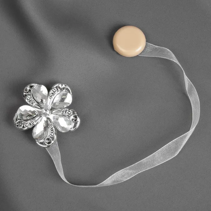 Такой подхват помогает не только собрать шторы, но и объединить элементы интерьера в единую композицию. Серебристый цвет легко сочетается с холодными и нейтральными оттенками, а форма цветка добавляет мягкий акцент без излишней декоративности. Подходит для гостиной, спальни или детской, где важны простота и выразительность в деталях.