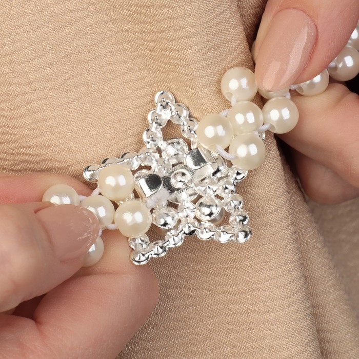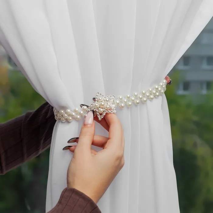 Фиксатор сохраняет целостность портьер — не оставляет заломов и следов после снятия. Белый оттенок сочетается с любыми шторами, а мягкая резинка равномерно распределяет нагрузку по поверхности ткани. Дизайн напоминает ювелирное украшение, что делает его частью интерьера, а не вспомогательным элементом.