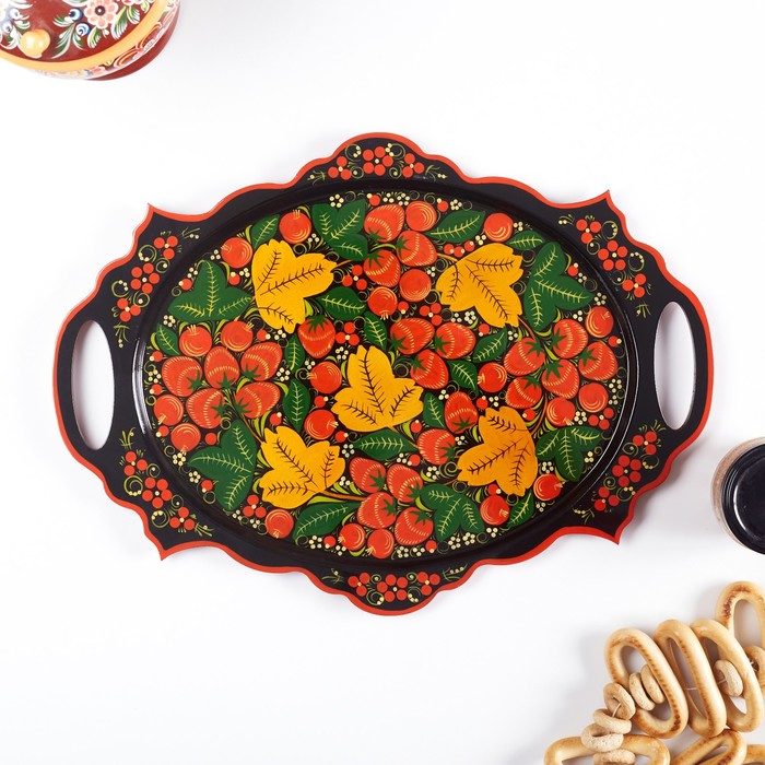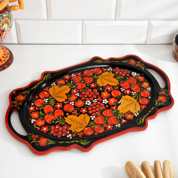 Поднос деревянный с ручками «Хохлома», овал, ручная роспись, 41×25 см