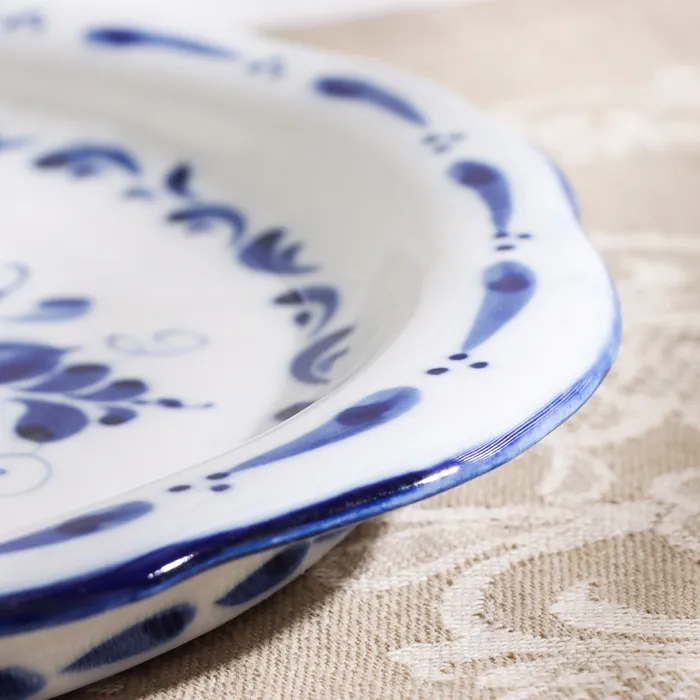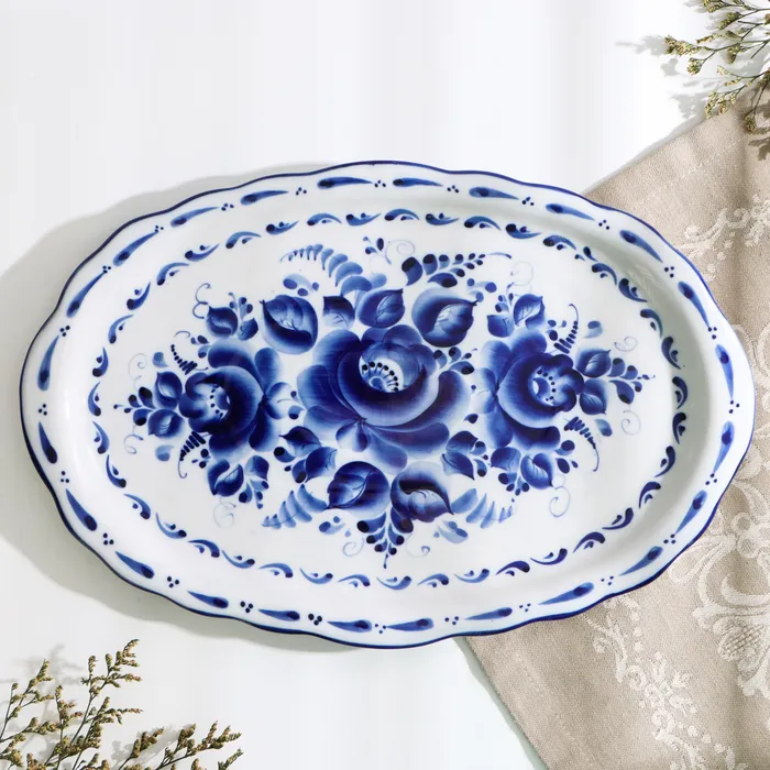 Ощутите изысканность русского фарфора с этим овальным подносом, где классическая гжель встречается с современной элегантностью. Белоснежная поверхность размером 33,5×23 см украшена тонкой ручной росписью, где каждый синий мазок хранит тепло мастера.