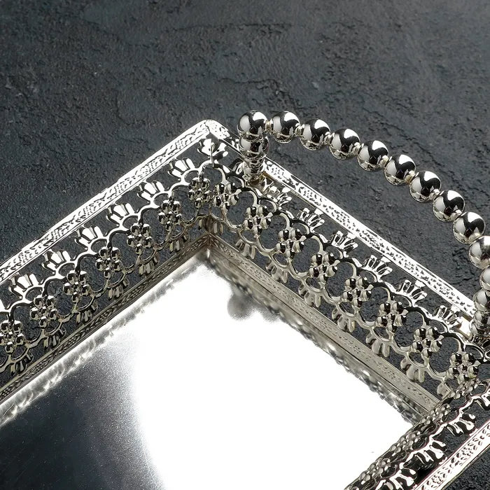 Поднос выполнен из металла, имеет удобные ручки для транспортировки, а также устойчивые ножки.