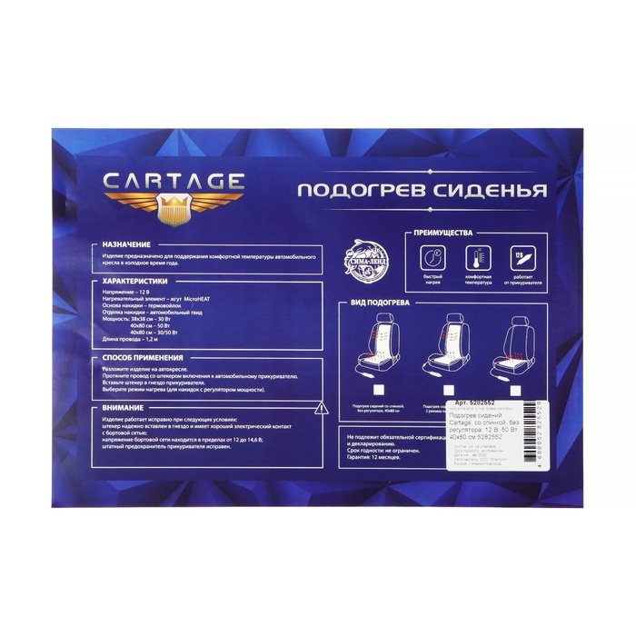 Подогрев сидений Cartage – это отличный выбор для вашего автомобиля. Он оснащен спинкой, которая обеспечивает дополнительный комфорт и удобство во время езды. Подогрев имеет мощность 50 Вт и работает от бортовой сети автомобиля 12 В. Размеры изделия составляют 40х80 см, что позволяет использовать его практически на любых сиденьях. В качестве нагревательного элемента используются нити MicroHeat, которые обеспечивают быстрый и равномерный нагрев. Благодаря этому аксессуару, ваше сиденье всегда будет теплым и комфортным, даже в самые холодные дни.