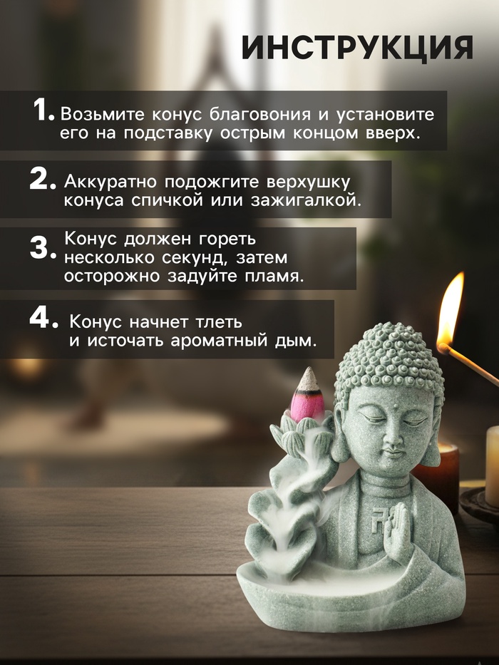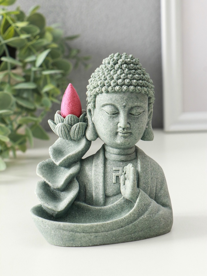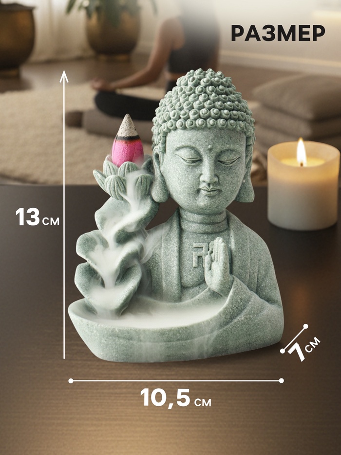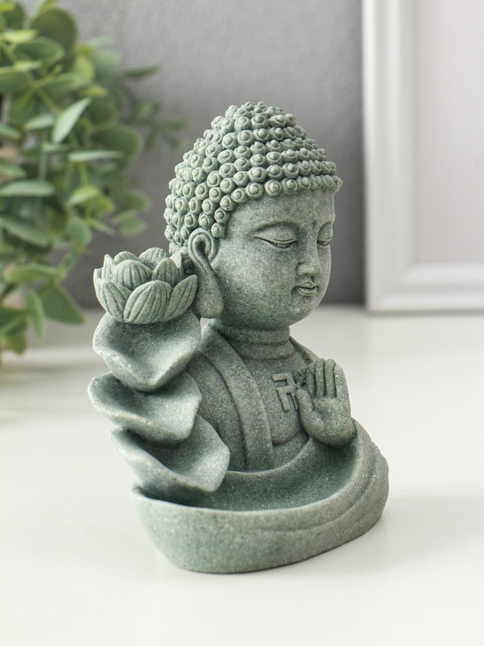 Погрузитесь в атмосферу спокойствия с каменной подставкой для конусных благовоний. Изящная фигура Будды и фонтан создают динамичную композицию, где струящийся дым превращает ритуал в медитацию. Этот аксессуар для ароматерапии станет центром гармонии в вашем доме.