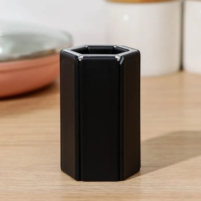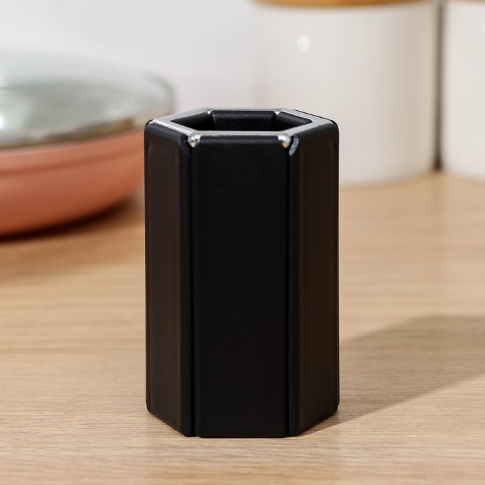- Стильный дизайн: подставка имеет стильный черный цвет и шестиугольную форму, что делает ее гармоничным дополнением к вашей кухне.