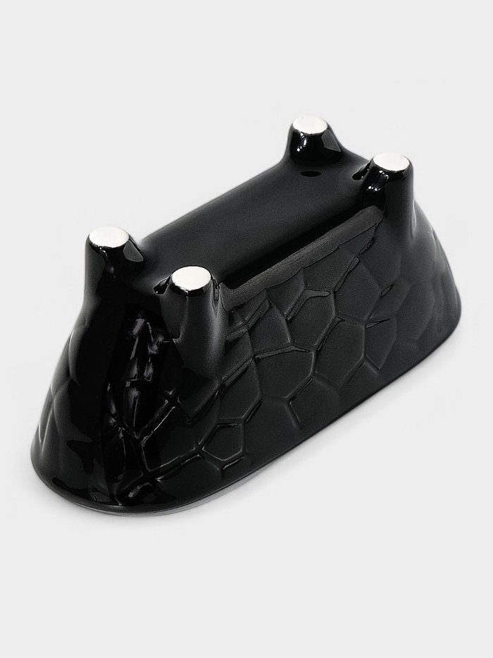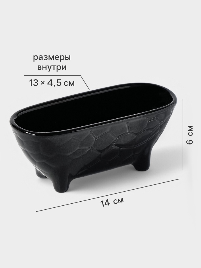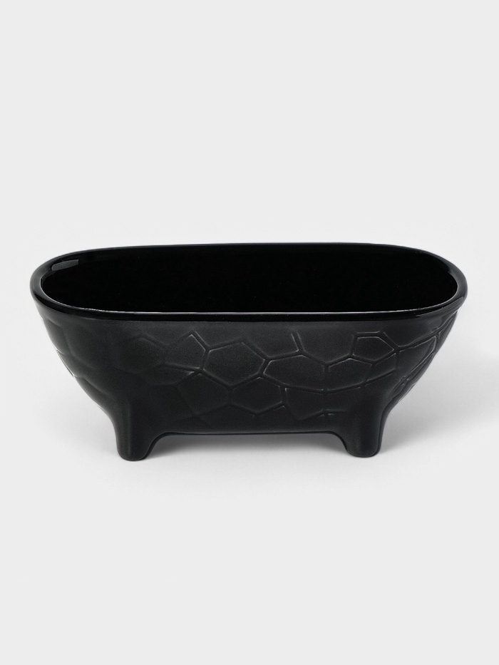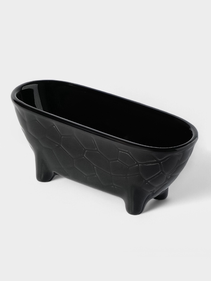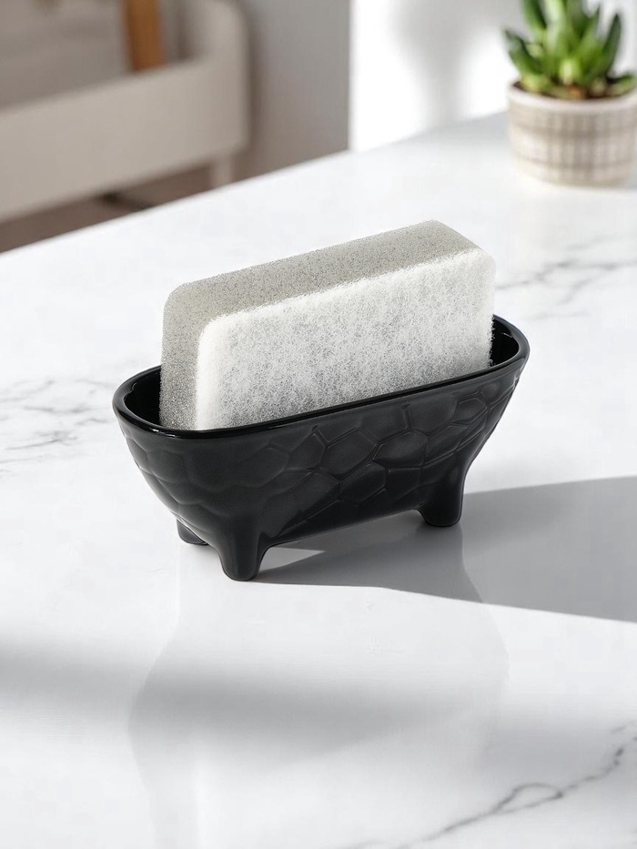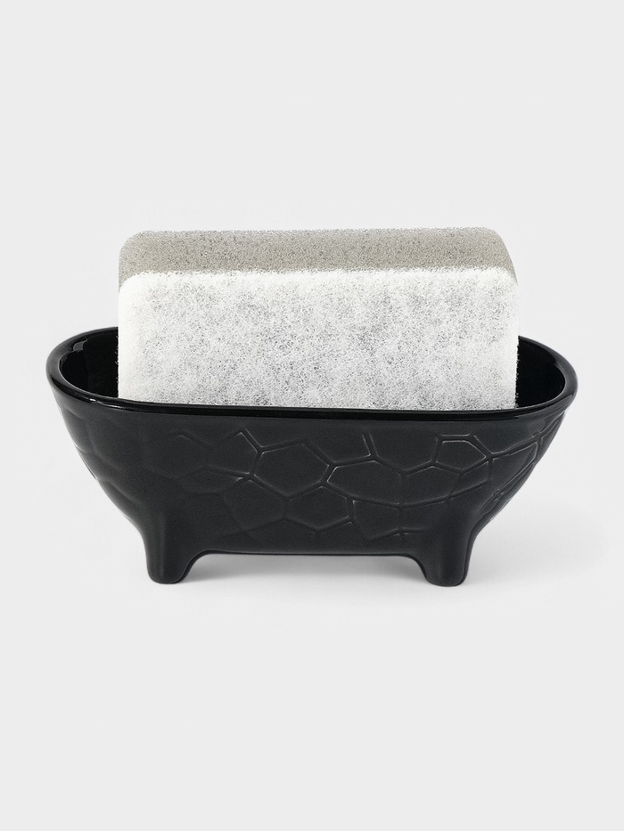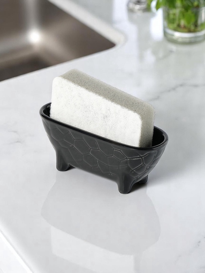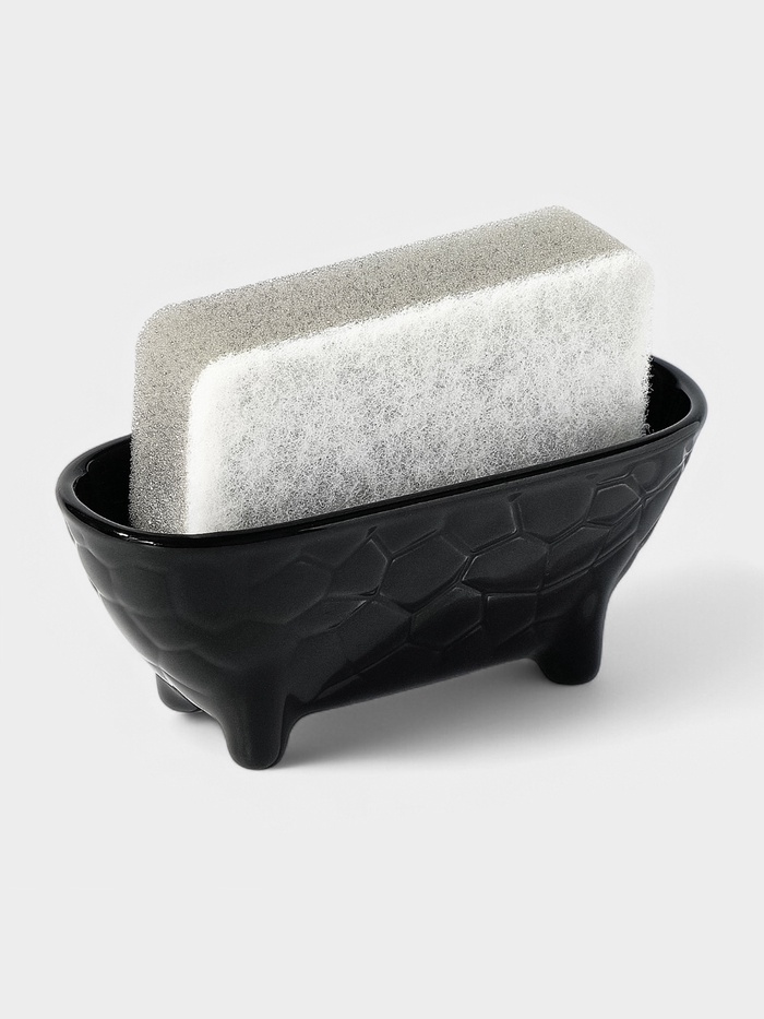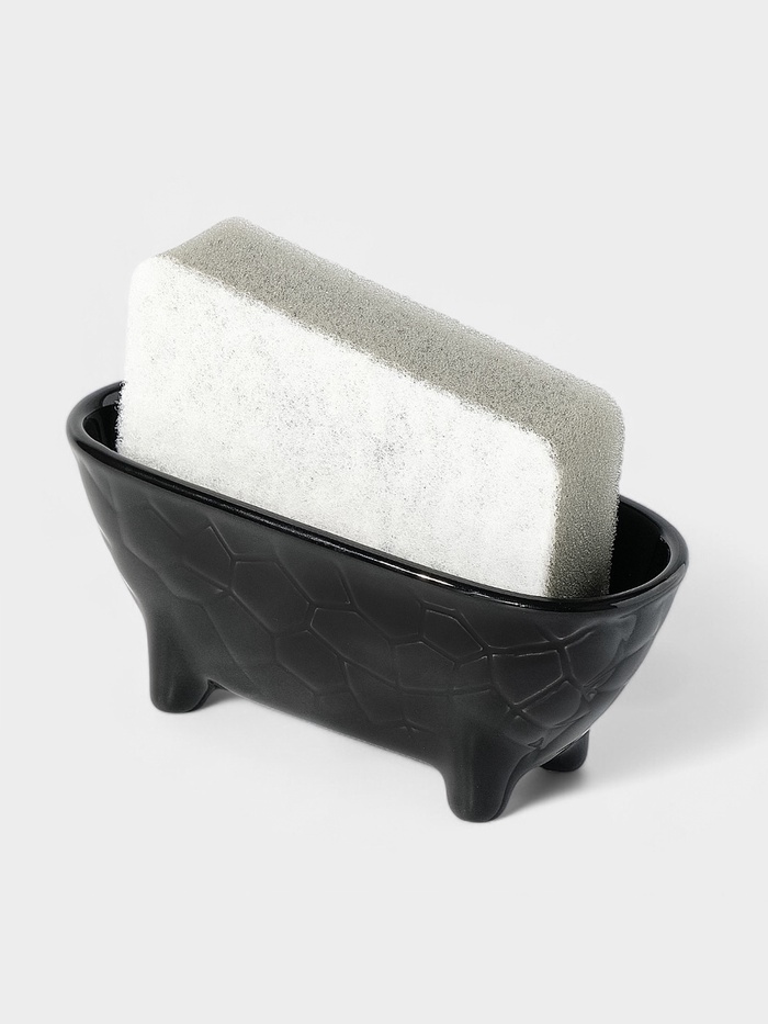Керамическая подставка для губки — практичный аксессуар для организации пространства у мойки. Черная матовая поверхность с рельефным узором создает стильный акцент. Настольное исполнение позволяет разместить подставку на любой поверхности.