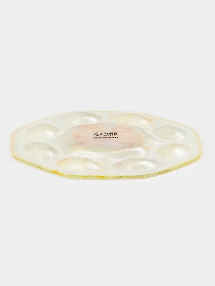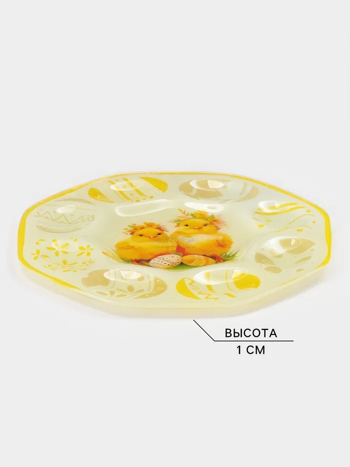 Эта подставка для яиц станет прекрасным дополнением вашего пасхального стола. Изготовленная из стекла, она имеет размеры 22×22×1 см и вмещает 8 яиц, что идеально подходит для праздничной сервировки. Желтый цвет и милые цыплята на рисунке создают радостное и праздничное настроение.