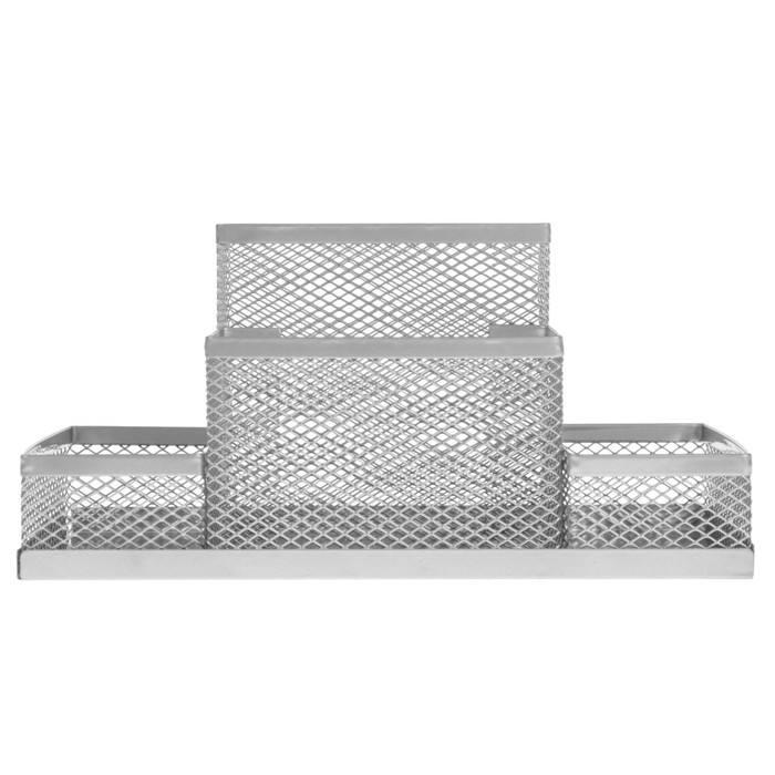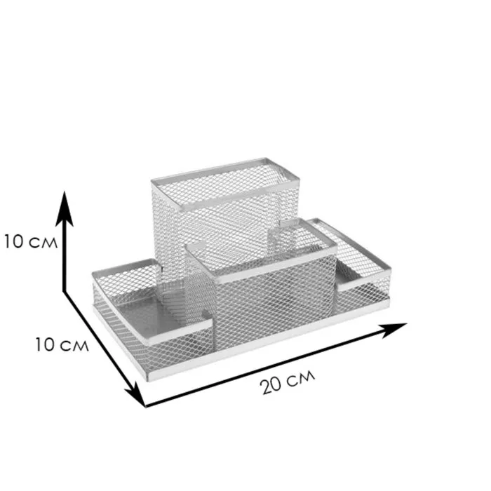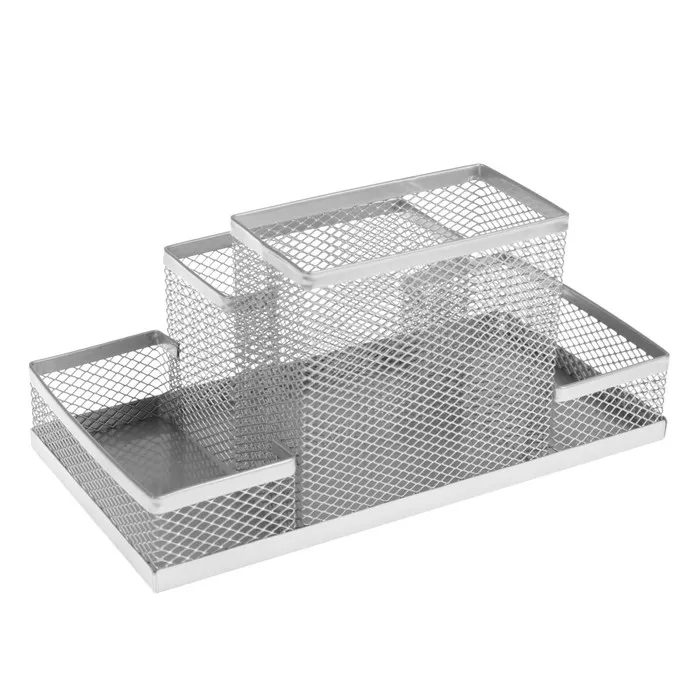 Настольный органайзер с четырьмя отделениями станет стильным дополнением вашего рабочего пространства. Изготовленный из металлической сетки, он прочен и идеально подойдёт для хранения канцелярских принадлежностей. Незаметный серый цвет легко впишется в любой офисный или домашний интерьер.