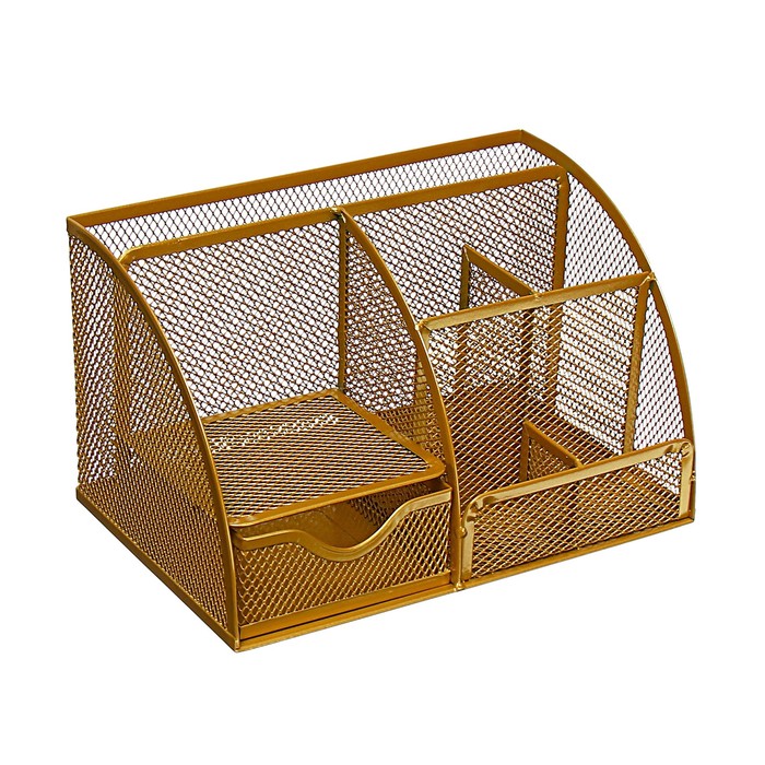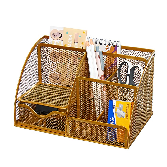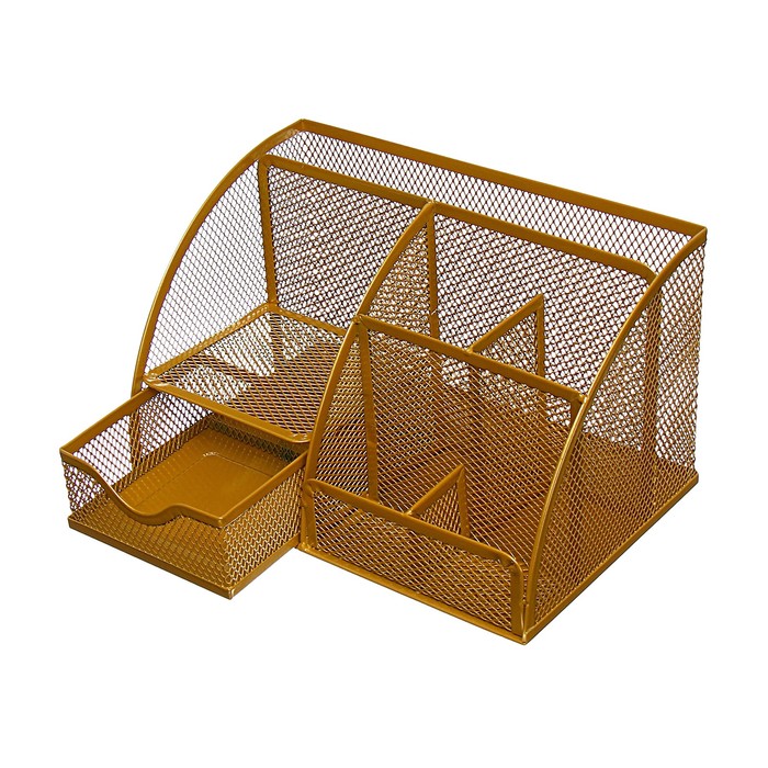 Органайзер для канцелярии золотистого цвета добавит нотку изысканности и порядка в ваш рабочий уголок. Этот металлический аксессуар станет не только практичным помощником, но и стильным элементом декора для вашего стола в офисе или дома.