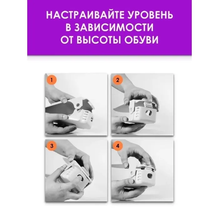 - Регулируемая высота: возможность настройки подставки позволяет использовать её для обуви разных типов и размеров, что делает её универсальным решением для всей семьи.